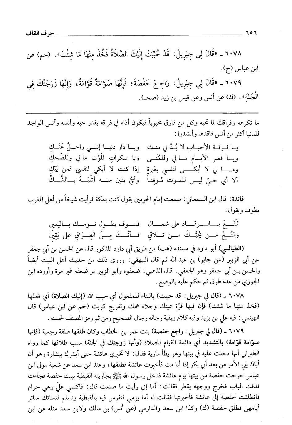 6079 - (قال لي جبريل راجع حفصة) بنت عمر بن الخطاب وكان طلقها طلقة رجعية (فإنها صوامة قوامة) بالتشديد أي دائمة القيام للصلاة (وأنها زوجتك في الجنة) سبب طلاقها كما رواه الطبراني أنها دخلت عليه في بيتها وهو يطأ مارية فقال : لا تخبري عائشة حتى أبشرك ببشارة وهو أن أباك يلي الأمر من بعد أبي بكر إذا أنا مت فأخبرت عائشة فطلقها.