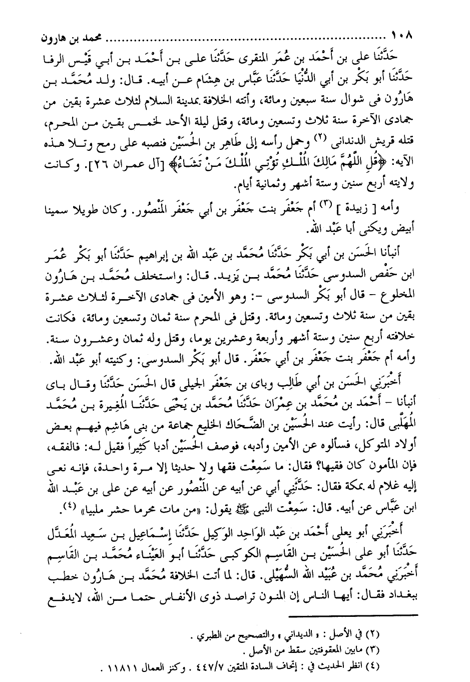 حدّثنا على بن أحمد بن عمر المنقري حدّثنا علي بن أحمد بن أبي قيس الرَّفَّاء حدّثنا أبو بكر بن أبي الدّنيا حَدَّثَنَا عباس بْن هشام عَنْ أَبِيهِ. قَالَ: ولد محمد بن هارون في شوال سنة سبعين ومائة، وأتته الخلافة بمدينة السلام لثلاث عشرة بقين من جمادى الآخرة سنة ثلاث وتسعين ومائة، وقتل ليلة الأحد لخمس بقين من المحرم، قتله قريش الدنداني [1] وحمل رأسه إلى طاهر بن الحسين فنصبه على رمح وتلا هذه الآية: قُلِ اللَّهُمَّ مالِكَ الْمُلْكِ تُؤْتِي الْمُلْكَ مَنْ تَشاءُ