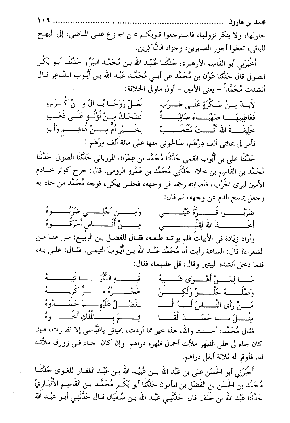 أَخْبَرَنِي أبو القاسم الأزهرى حدّثنا عبيد الله بن محمّد البزّاز حَدَّثَنَا أبو بكر الصولي قَالَ حَدَّثَنَا عون بن مُحَمَّد عن أَبِي مُحَمَّد عبد اللَّه بن أيوب الشاعر قَالَ أنشدت مُحَمَّدًا- يعني الأمين- أول ما ولي الخلافة: