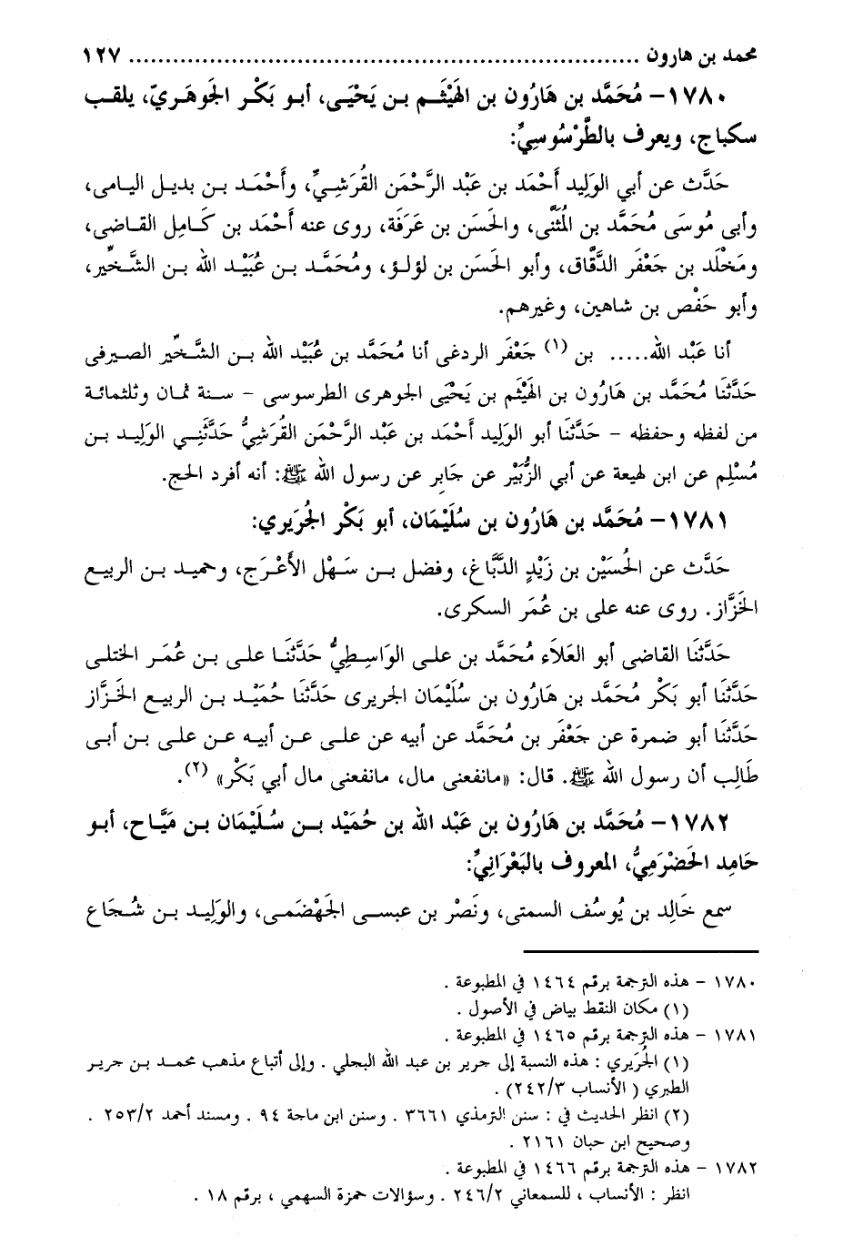1780- محمد بن هارون بن الهيثم بن يحيى، أبو بكر الجوهري، يلقب سكباج، ويعرف بالطرسوسي [1] :