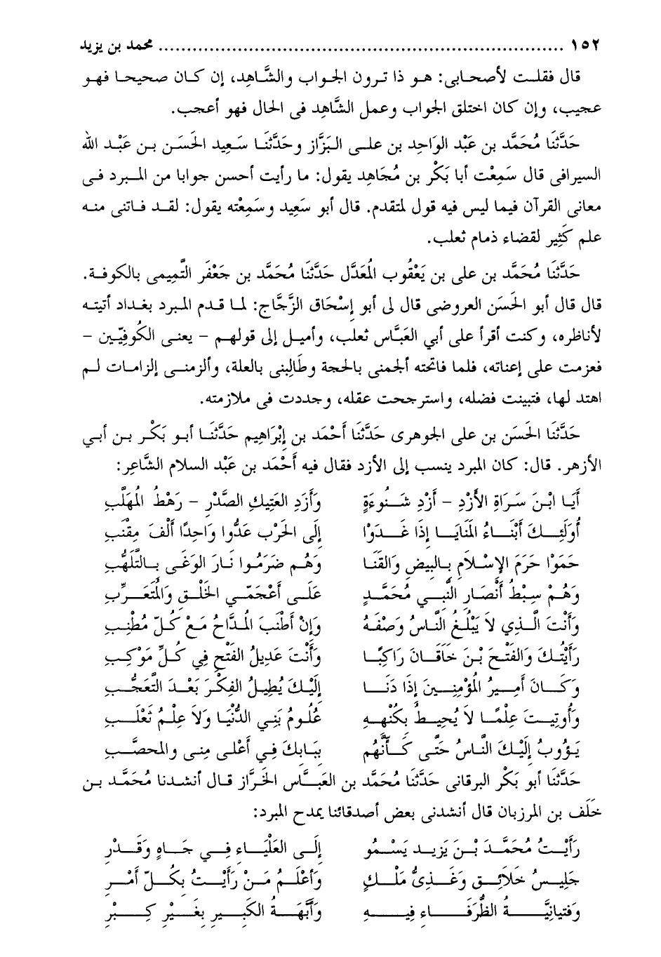 حدّثنا أبو بكر البرقاني حدّثنا محمّد بن العبّاس الخرّاز قَالَ أنشدنا مُحَمَّد بن خلف بن المرزبان قَالَ أنشدني بعض أصدقائنا يمدح المبرد: