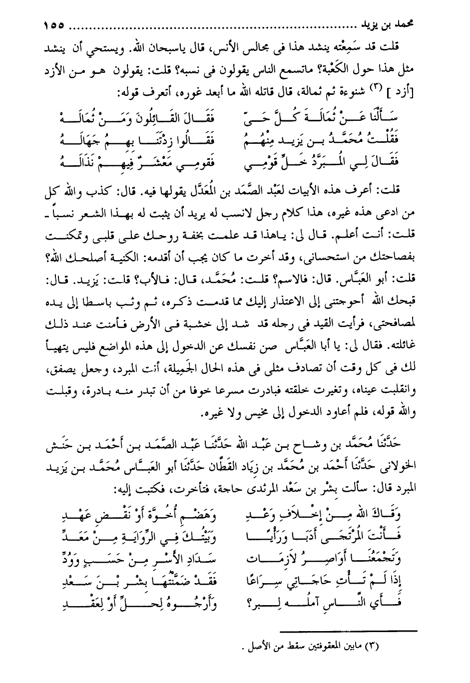 قلت: أبو العباس. قَالَ: فالاسم؟ قلت: محمد، قَالَ: فالأب؟ قلت: يزيد. قَالَ: