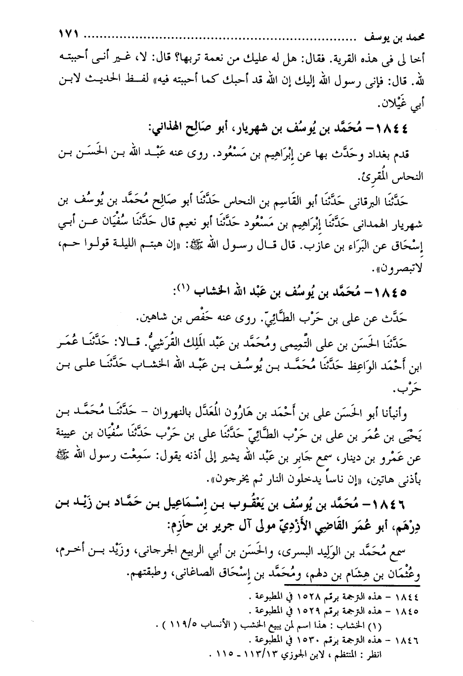 . 1846- مُحَمَّدُ بْنُ يُوسُفَ بْنِ يَعْقُوبَ بْنِ إِسْمَاعِيلَ بْنِ حَمَّادِ بن زيد بن درهم، أبو عمر القاضي الأزدي مولى آل جرير بْن حازم [4] :