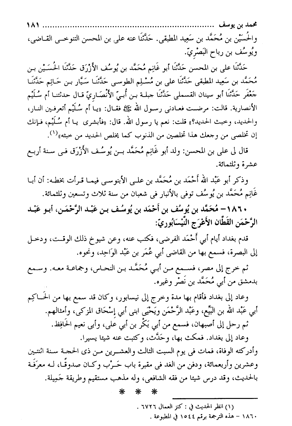 1860- محمد بن يوسف بن أحمد بن يوسف بن عبد الرحمن، أبو عبد الرحمن القطان الأعرج النّيسابوريّ [2] :