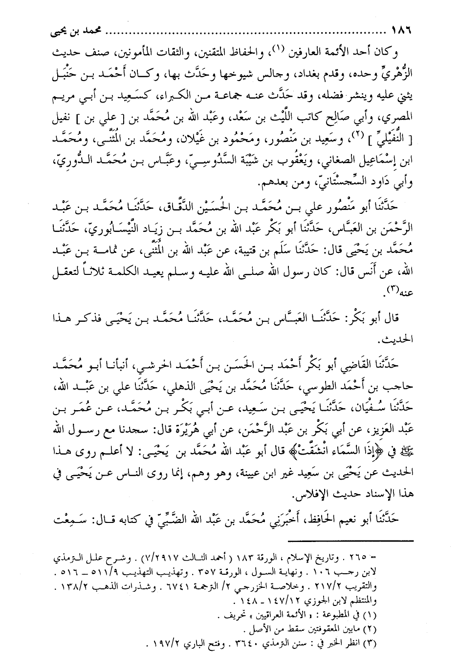 حدّثنا أَبُو منصور علي بن مُحَمَّد بن الحسين الدّقّاق، حَدَّثَنَا مُحَمَّد بْنُ عَبْدِ الرَّحْمَنِ بْنِ الْعَبَّاسِ، حَدَّثَنَا أَبُو بَكْرٍ عَبْدُ اللَّهِ بْنُ مُحَمَّدِ بْنِ زياد النّيسابوريّ، حَدَّثَنَا مُحَمَّدُ بْنُ يَحْيَى قَالَ: حَدَّثَنَا سَلَمُ بْنُ قُتَيْبَةَ، عَنْ عَبْدِ اللَّهِ بْنِ الْمُثَنَّى، عَنْ ثُمَامَةَ بْنِ عَبْدِ اللَّهِ، عَنْ أَنَسٍ قَالَ: كَانَ رَسُولُ اللَّهِ صَلَّى اللَّهُ عَلَيْهِ وَسَلَّمَ يُعِيدُ الْكَلَمَةَ ثَلاثًا لِتُعْقَلَ عَنْهُ [3] .
