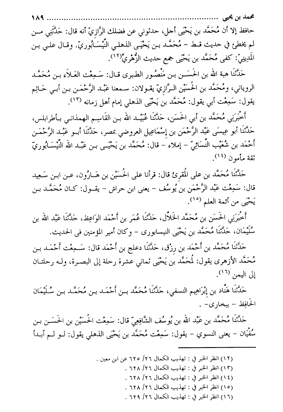 أخبرني محمّد بن أبي الحسن، حدّثنا عبيد الله بن القاسم الهمذاني بأطرابلس، حَدَّثَنَا أَبُو عيسى عَبْد الرَّحْمَن بْن إِسْمَاعِيل العروضي بمصر، حَدَّثَنَا أَبُو عَبْدِ الرَّحْمَنِ أَحْمَدُ بْنُ شُعَيْبٍ النَّسَائِيُّ- إملاء- قَالَ: محمد بن يحيى بن عبد الله النّيسابوريّ ثقة مأمون [3] .