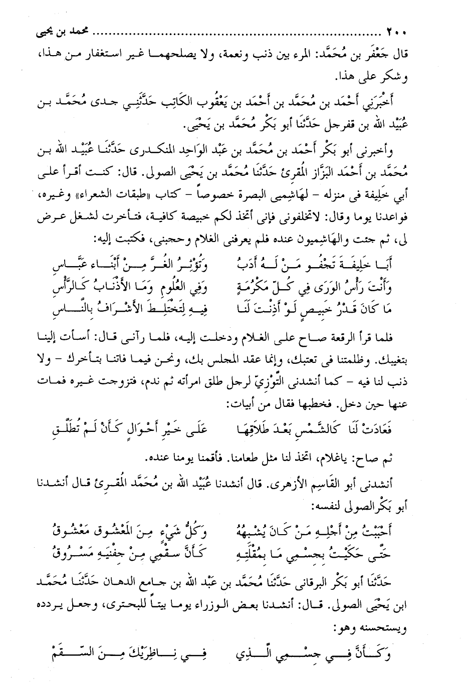 أَخْبَرَنِي أحمد بن محمد بن أحمد بن يعقوب الكاتب حَدَّثَنِي جدي محمد بن عبيد الله بن قفرجل حَدَّثَنَا أبو بكر محمد بن يحيى.