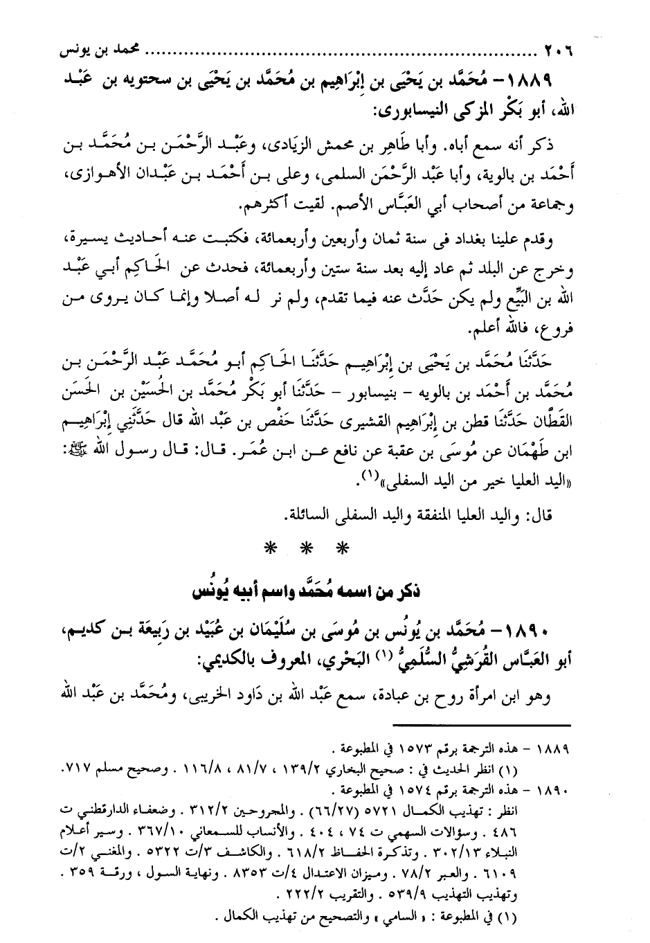 حدّثنا محمّد بن يحيى بن إبراهيم حدّثنا الحاكم أَبُو مُحَمَّدٍ عَبْدُ الرَّحْمَنِ بْنُ مُحَمَّدِ بْنِ أحمد بن بالويه- بنيسابور- حَدَّثَنَا أَبُو بَكْرٍ مُحَمَّدُ بْنُ الْحُسَيْنِ بْنِ الْحَسَنِ القطّان حدّثنا قطن بن إبراهيم القشيري حَدَّثَنَا حَفْصُ بْنُ عَبْدِ اللَّهِ قَالَ حَدَّثَنِي إبراهيم ابن طَهْمَانَ عَنْ مُوسَى بْنِ عُقْبَةَ عَنْ نَافِعٍ عَنِ ابْنِ عُمَرَ. قَالَ: قَالَ رَسُولُ اللَّهِ صَلَّى اللَّهُ عَلَيْهِ وَسَلَّمَ: «الْيَدُ الْعُلْيَا خَيْرٌ مِنَ الْيَدِ السُّفْلَى» [2]