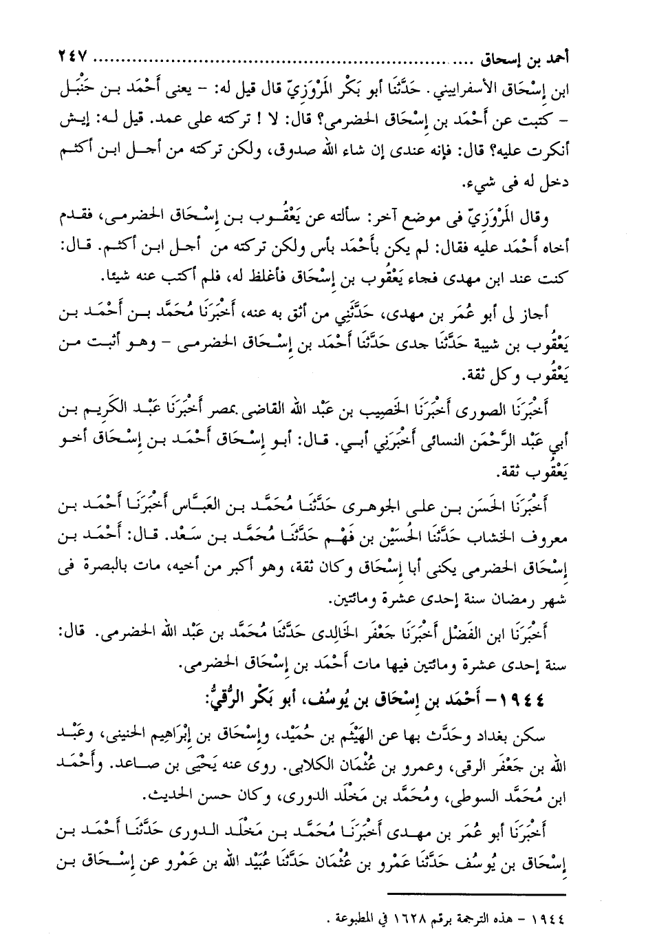 أجاز لي أبو عمر بن مهدى، حدّثني من أثق بِهِ عَنْهُ، أَخْبَرَنَا مُحَمَّد بْن أحمد بن يعقوب بن شيبة حدّثنا جدي حَدَّثَنَا أَحْمَد بْن إِسْحَاق الحضرمي- وهو أثبت من يَعْقُوب وكلٌّ ثقة.