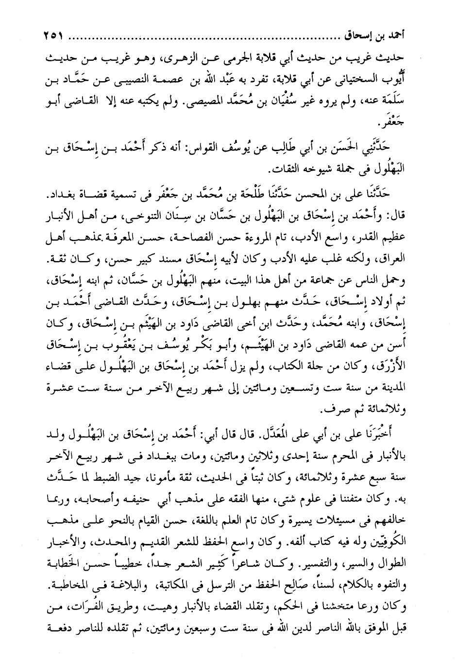 قَالَ: وأَحْمَد بْن إِسْحَاق بْن البهلول بْن حسان بْن سنان التنوخي، من أهل الأنبار عظيم القدر، واسع الأدب، تام المروءة حسن الفصاحة، حسن المعرفة بمذهب أهل العراق، ولكنه غلب عَلَيْهِ الأدب وَكَانَ لأبيه إِسْحَاق مسند كبير حسن، وَكَانَ ثِقَةً.