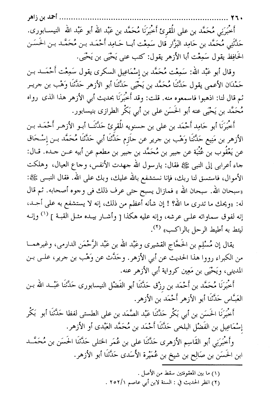أَخْبَرَنَا مُحَمَّدُ بْنُ أَحْمَدَ بْنِ رِزْقٍ حدّثنا أبو الفضل النيسابوري حدّثنا عبد الله بن العبّاس حدّثنا أبو الأزهر أحمد بن الأزهر.
