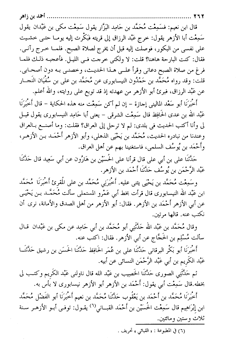 أَخْبَرَنَا مُحَمَّد بْن أَحْمَدَ بْن يَعْقُوب حدّثنا محمّد بن نعيم أخبرنا أبو الفضل محمّد ابن إِبْرَاهِيم قَالَ سَمِعْتُ الْحُسَيْن بْن أَحْمَدَ القبَّاني [1] يَقُولُ: توفي أَبُو الأزهر سنة ثلاث وستين ومائتين.