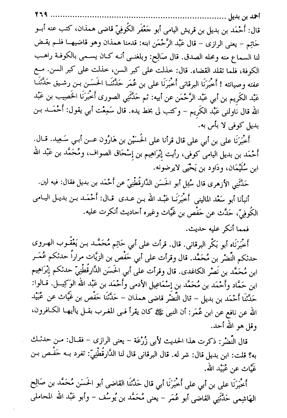 أَخْبَرَنَاهُ أَبُو بَكْرٍ الْبَرْقَانِيُّ. قَالَ. قَرَأْتُ عَلَى أَبِي حَاتِمٍ مُحَمَّدِ بْنِ يَعْقُوبَ الْهَرَوِيِّ حَدَّثَكُمُ النَّضْرُ بْنُ مُحَمَّدٍ. قَالَ وَقَرَأْتُ عَلَى أَبِي حَفْصِ بْنِ الزَّيَّاتِ مِرَارًا حَدَّثَكُمْ عمر ابن مُحَمَّدِ بْنِ نَصْرٍ الْكَاغَدِيُّ. قَالَ وَقَرَأْتُ عَلَى أبي الحسن الدّارقطنيّ حدثكم إبراهيم ابن حَمَّادٍ وَأَحْمَدُ بْنُ مُحَمَّدِ بْنِ إِسْمَاعِيلَ الأَدَمِيُّ وَأَحْمَدُ بْنُ عَبْدِ اللهِ الوَكِيْل. قَالُوا: