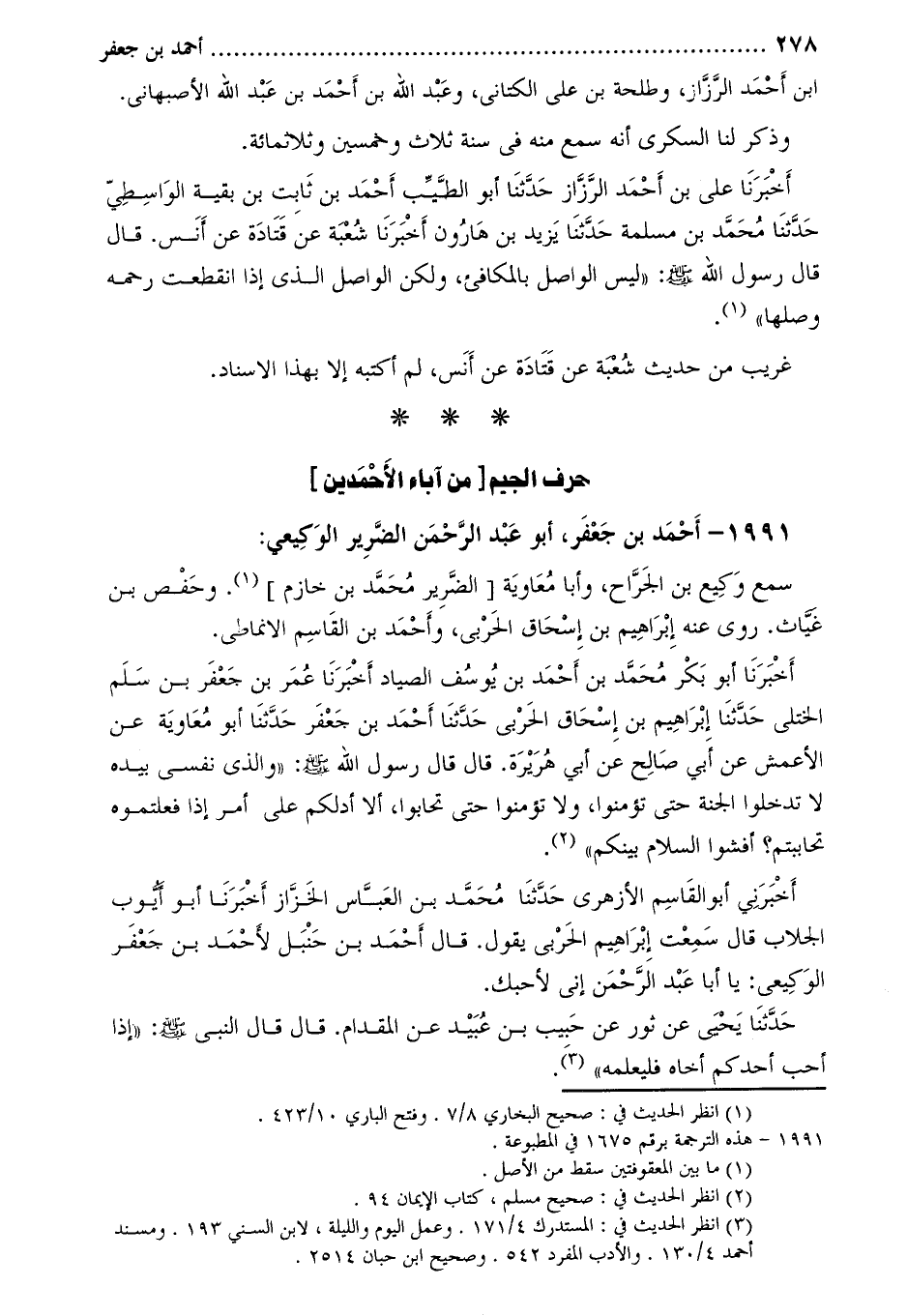 أَخْبَرَنَا أَبُو بَكْرٍ مُحَمَّدُ بْنُ أَحْمَد بْنِ يوسف الصياد أَخْبَرَنَا عُمَرُ بْنُ جَعْفَرِ بْنِ سَلْمٍ الْخُتُلِّيُّ حدّثنا إبراهيم بن إسحاق الحربي حدّثنا أحمد بن جعفر حَدَّثَنَا أَبُو مُعَاوِيَةَ عَنِ الأَعْمَشِ عَنْ أَبِي صَالِحٍ عَنْ أَبِي هُرَيْرَةَ. قَالَ قَالَ رَسُولُ اللَّهِ صَلَّى اللَّهُ عَلَيْهِ وَسَلَّمَ: «وَالَّذِي نَفْسِي بِيَدِهِ لا تَدْخُلُوا الْجَنَّةَ حَتَّى تُؤْمِنُوا، وَلا تُؤْمِنُوا حَتَّى تَحَابُّوا، أَلا أَدُلُّكُمْ عَلَى أَمْرٍ إِذَا فَعَلْتُمُوهُ تَحَابَبْتُمْ؟ أفْشُوا السَّلامَ بَيْنَكُمْ» [4]