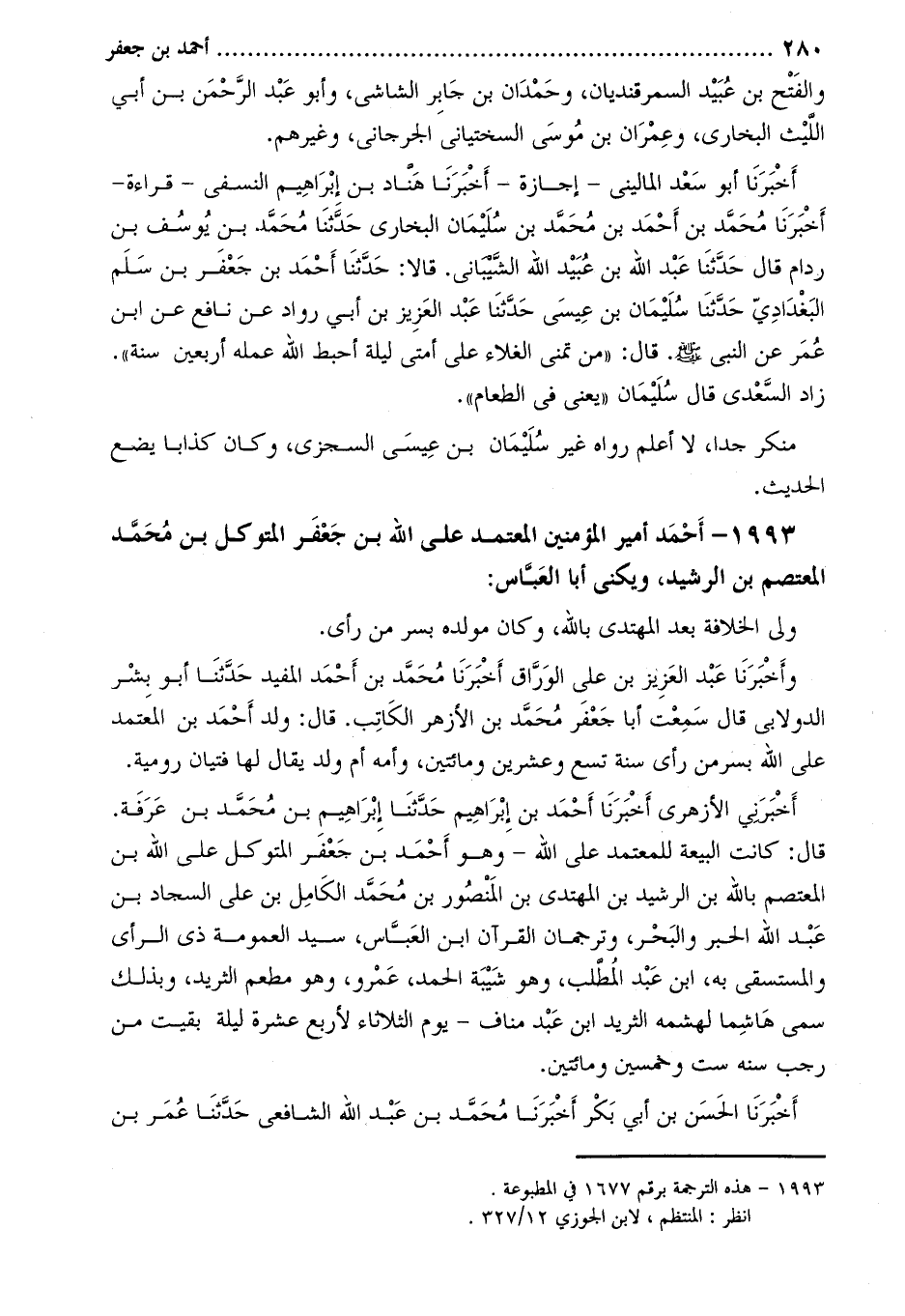 1993- أَحْمَد أمير المؤمنين المعتمد على اللَّه بْن جَعْفَر المتوكل بْن مُحَمَّد المعتصم بْن الرشيد، ويكنى أَبَا الْعَبَّاس [1] :