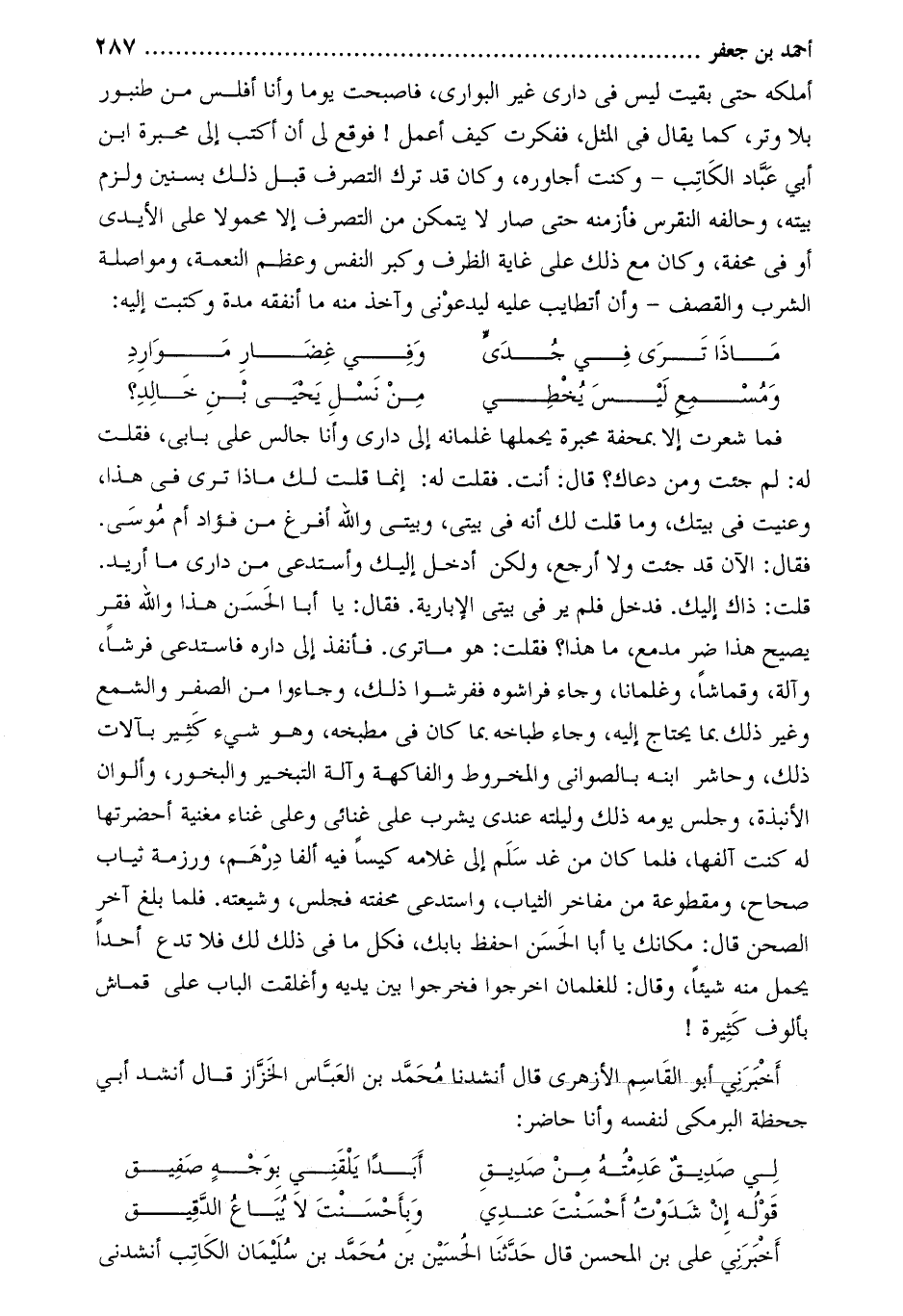 قلت: ذاك إليك. فدخل فلم ير فِي بيتي إلا بارية. فَقَالَ: يا أَبَا الْحَسَن هَذَا والله فقر يصيح هذا ضر مدمع، ما هَذَا؟ فقلت: هو ما ترى. فأنفذ إِلَى داره فاستدعى فرشا، وآله، وقماشا، وغلمانا، وجاء فراشوه ففرشوا ذلك، وجاءوا من الصفر والشمع وغير ذلك بما يحتاج إليه، وجاء طبَّاخه بما كَانَ فِي مطبخه، وهو شيء كثير بآلات ذلك، وحاشر ابنه بالصواني والمخروط والفاكهة وآله التبخير والبخور، والوان الأنبذة، وجلس يومه ذلك وليلته عندي يشرب على غنائي وعلى غناء مغنية أحضرتها لَهُ كنت آلفها، فلما كَانَ من غد سلم إِلَى غلامه كيسا فيه ألفا درهم، ورزمة ثياب صحاح، ومقطوعة من مفاخر الثياب، واستدعى محفته فجلس، وشيعته. فلما بلغ آخر الصحن قَالَ: مكانك يا أَبَا الْحَسَن احفظ بابك، فكل ما فِي ذلك لك فلا تدع أحدا يحمل منه شيئا، وَقَالَ: للغلمان اخرجوا فخرجوا بين يديه وأغلقت الباب على قماش بألوف كثيرة! أَخْبَرَنِي أَبُو الْقَاسِم الأَزْهَرِيّ قَالَ أنشدنا مُحَمَّد بْن الْعَبَّاس الخزاز قَالَ أنشد أَبِي جحظة البرمكي لنفسه وأنا حاضر: