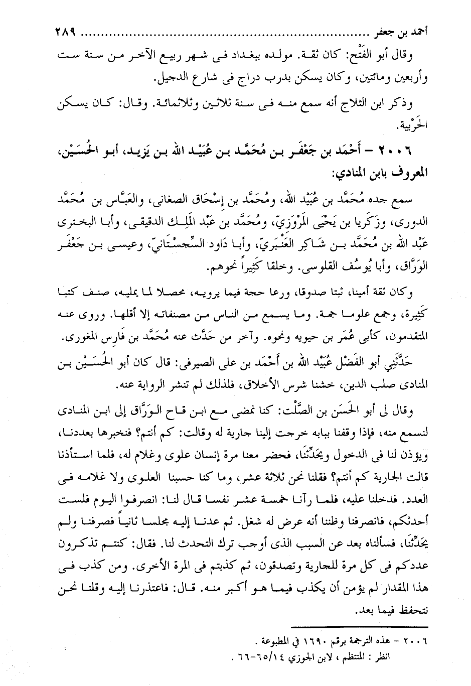 2006- أَحْمَد بْن جعفر بْن مُحَمَّد بْن عُبَيْد اللَّهِ بْن يَزِيد، أَبُو الْحُسَيْن، الْمَعْرُوف بابن المنادي [1] :