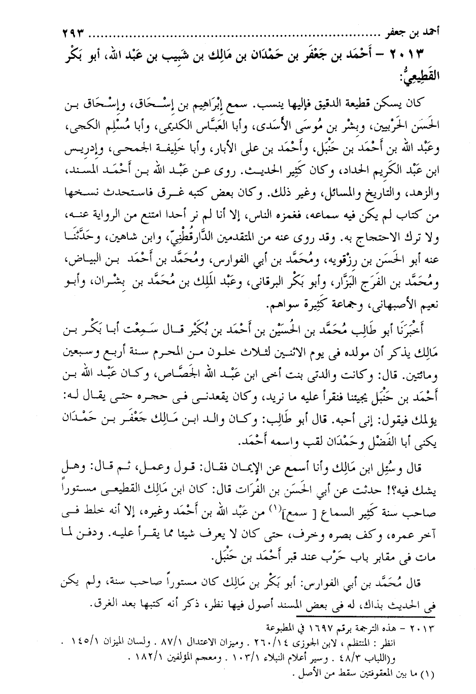 2013- أَحْمَدُ بْنُ جَعْفَرِ بْنِ حَمْدَانَ بْنِ مَالِكٍ بْن شبيب بْن عَبْد اللَّه، أَبُو بَكْر القطيعيّ [1] :