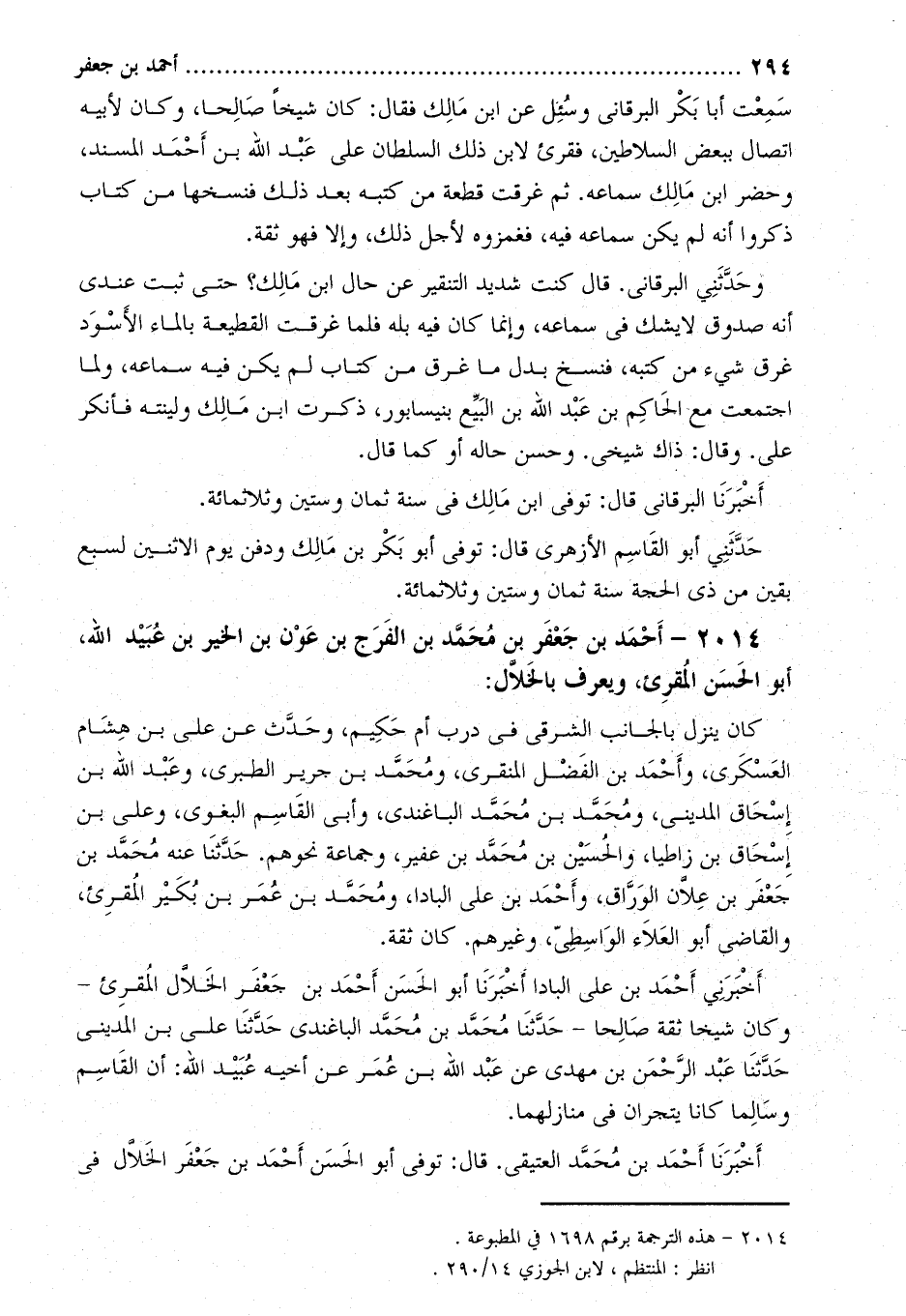 2014- أَحْمَد بْن جَعْفَر بْن مُحَمَّدِ بْنِ الْفَرَجِ بن عون بن الخير بْن عُبَيْد اللَّهِ، أَبُو الْحَسَن الْمُقْرِئ، ويعرف بالخلال [1] :