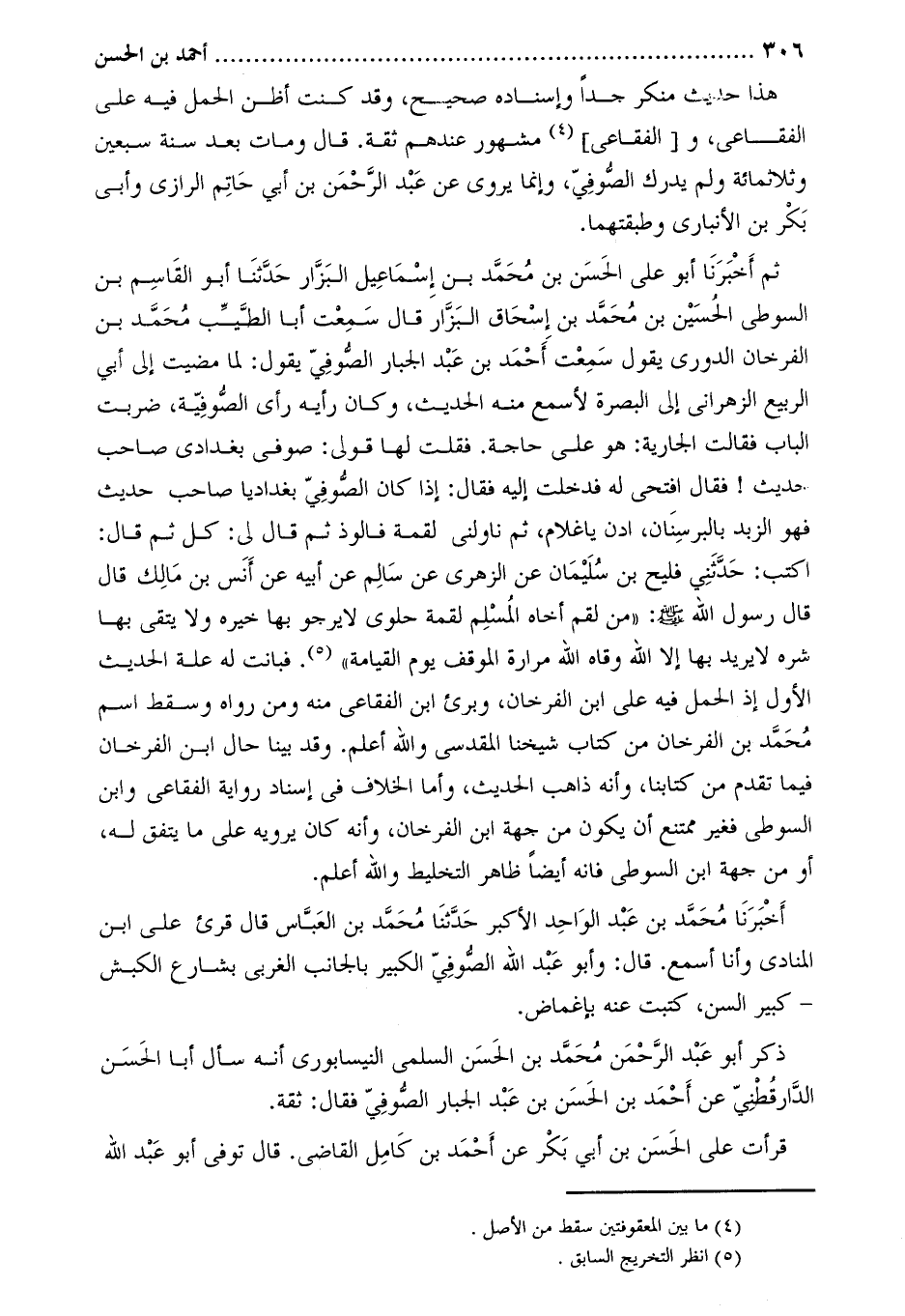 . فبانت له عِلَّةُ الْحَدِيثِ الأَوَّلِ إِذِ الْحَمْلُ فِيهِ عَلَى ابن الفرخان، وبرئ ابن الفقاعى منه ومن رَوَاهَ وَسَقَطَ اسْمُ مُحَمَّدِ بْنِ الْفَرُّخَانِ مِنْ كِتَابِ شَيْخِنَا الْمَقْدِسِيِّ وَاللَّهُ أَعْلَمُ. وَقَدْ بَيَّنَا حَالَ ابْنِ الْفَرُّخَانِ فِيمَا تَقَدَّمَ مِنْ كِتَابِنَا، وأنه ذاهب الحديث، وأما الخلاف في إسناد رِوَايَةِ الْفُقَّاعِيِّ وَابْنِ السَّوْطِيِّ فَغَيْرُ مُمْتَنِعٌ أَنْ يَكُونَ مِنْ جِهَةِ ابْنِ الْفَرُّخَانِ، وَأَنَّهُ كَانَ يَرْوِيهِ عَلَى مَا يُتَفَّقُ لَهُ، أَوْ من جِهَةِ ابْنِ السَّوْطِيِّ فَإِنَّهُ أَيْضًا ظَاهِرُ التَّخْلِيطِ وَاللَّهُ أَعْلَمُ.