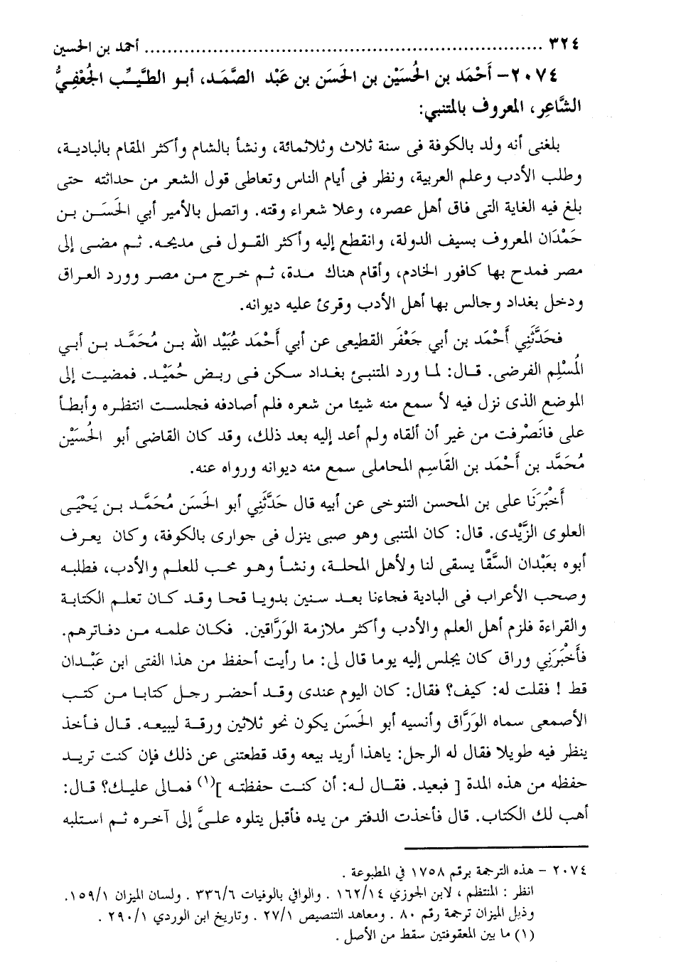 2074- أَحْمَد بْن الْحُسَيْن بْن الْحَسَن بْن عَبْد الصمد، أَبُو الطَّيِّب الجعفي الشاعر، الْمَعْرُوف بالمتنبي [1] :