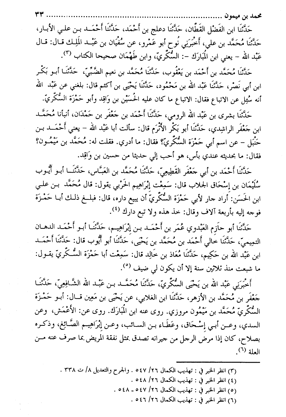 حدّثنا بشرى بن عبد الله الرومي، حدّثنا أحمد بن جعفر بن حمدان، أنبأنا محمّد ابن جعفر الراشدي، حَدَّثَنَا أبو بكر الأثرم قَالَ: سألت أبا عَبْد اللَّهِ- يعني أَحْمَد بْن حنبل- عَنِ اسم أبي حمزة السكري؟ فقال: ما أدري. فقلت له: محمد بن ميمون؟