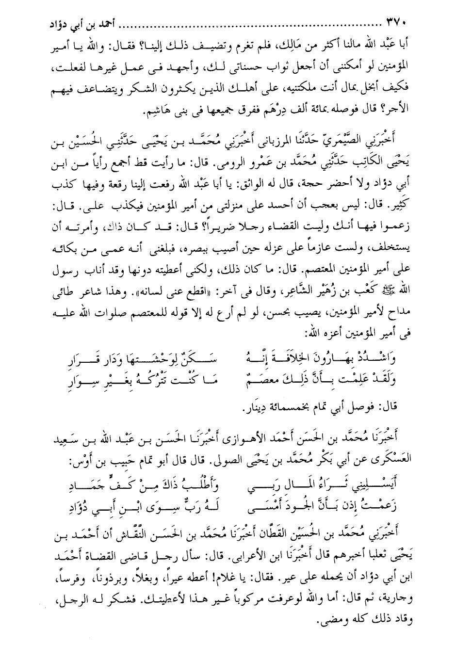 زعموا فيها إنك وليت القضاء رجلا ضريرا؟ قَالَ: قد كَانَ ذاك، وأمرته أن يستخلف، ولست عازما على عزله حين أصيب ببصره، فبلغني أنه عمي من بكائه على أمير المؤمنين المعتصم. قَالَ: ما كَانَ ذلك، ولكني أعطيته دونها وقد أناب رسول اللَّه صَلَّى اللَّهُ عَلَيْهِ وَسَلَّمَ كعب بْن زهير الشاعر، وَقَالَ فِي آخر: «أقطع عنى لسانه» . وهذا شاعر طائي مداح لأمير المؤمنين، يصيب بحسن، لو لم أرع لَهُ إلا قوله للمعتصم صلوات اللَّه عَلَيْهِ فِي أمير المؤمنين أعزه اللَّه: