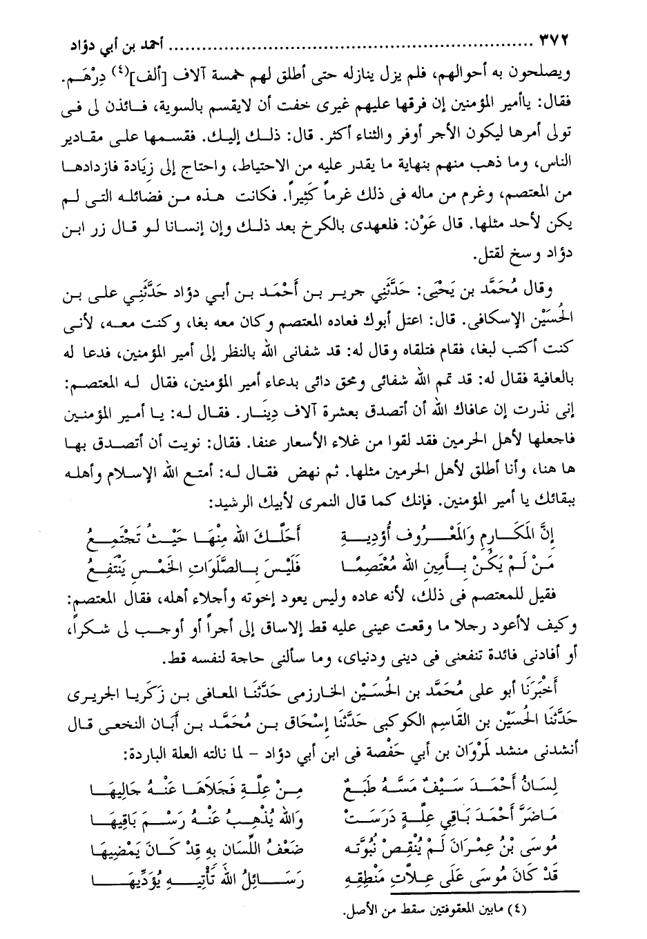 فَقَالَ: يَا أَمِيرَ الْمُؤْمِنِينَ إن فرقها عَلَيْهِمْ غيرى خفت أن لا يقسم بالسوية، فائذن لي فِي تولى أمرها ليكون الأجر أوفر والثناء أكثر. قَالَ: ذلك إليك. فقسمها على مقادير الناس، وما ذهب منهم بنهاية ما يقدر عَلَيْهِ من الاحتياط، واحتاج إِلَى زيادة فازدادها من المعتصم، وغرم من ماله فِي ذلك غرما كثيرا. فكانت هَذِهِ من فضائله التي لم يكن لأحد مثلها. قَالَ عون: فلعهدي بالكرخ بعد ذلك وأن إنسانا لو قَالَ زر ابن دؤاد وسخ لقتل.