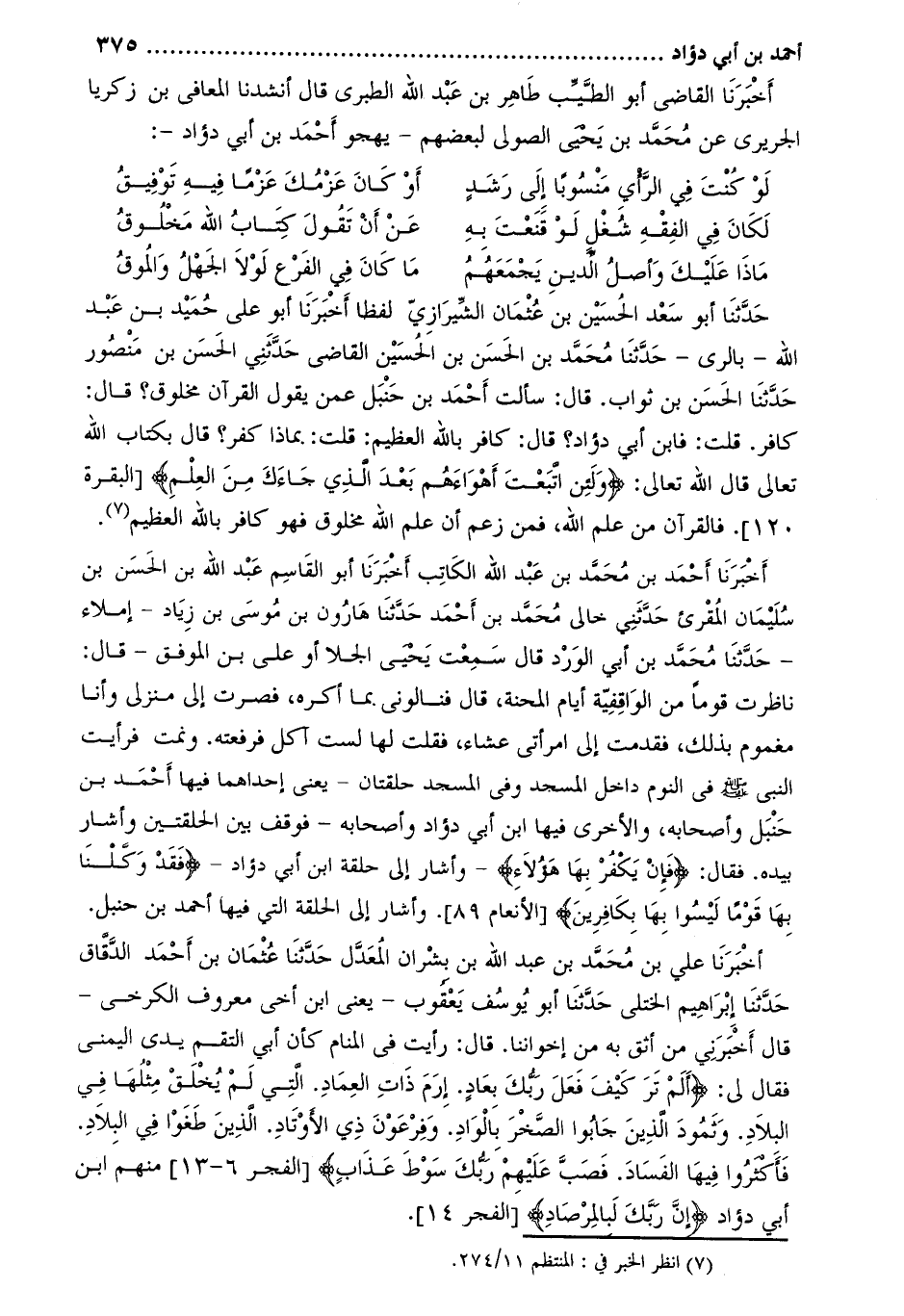 ناظرت قوما من الواقفيّة أيام المحنة، قَالَ فنالوني بما أكره، فصرت إِلَى منزلي وأنا مغموم بذلك، فقدمت إِلَيَّ امرأتي عشاء، فقلت لها لست آكل فرفعته. ونمت فَرَأَيْتُ النَّبِيّ صَلَّى اللَّهُ عَلَيْهِ وَسَلَّمَ فِي النَّوْمِ داخل المسجد وفي المسجد حلقتان- يعني إحداهما فيها أَحْمَد بْن حنبل وأصحابه، والأخرى فيها ابْن أَبِي دؤاد وأصحابه- فوقف بين الحلقتين وأشار بيده. فَقَالَ: فَإِنْ يَكْفُرْ بِها هؤُلاءِ