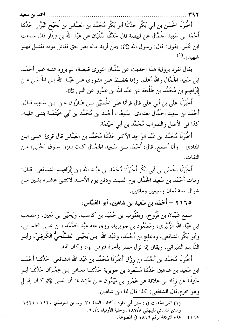 أخبرنا الحسن بن أبي بكر حَدَّثَنَا أَبُو بَكْرٍ مُحَمَّدُ بْنُ الْعَبَّاسِ بْنِ نجيح البزّار حَدَّثَنَا أَحْمَدُ بْنُ سَعِيدٍ الْجَمَّالُ عَنْ قَبِيصَةَ قَالَ حَدَّثَنَا سُفْيَانُ عَنْ عَبْدِ اللَّهِ بْنِ دِينَارٍ قَالَ سَمِعْتُ ابْنَ عُمَرَ. يَقُولُ: قَالَ: رَسُولُ اللَّهِ صَلَّى اللَّهُ عَلَيْهِ وَسَلَّمَ: «مَنْ أُرِيدَ مَالُهُ بِغَيْرِ حَقٍّ فَقَاتَلَ دُونَهُ فَقُتِلَ فَهُوَ شَهِيدٌ» . [1]