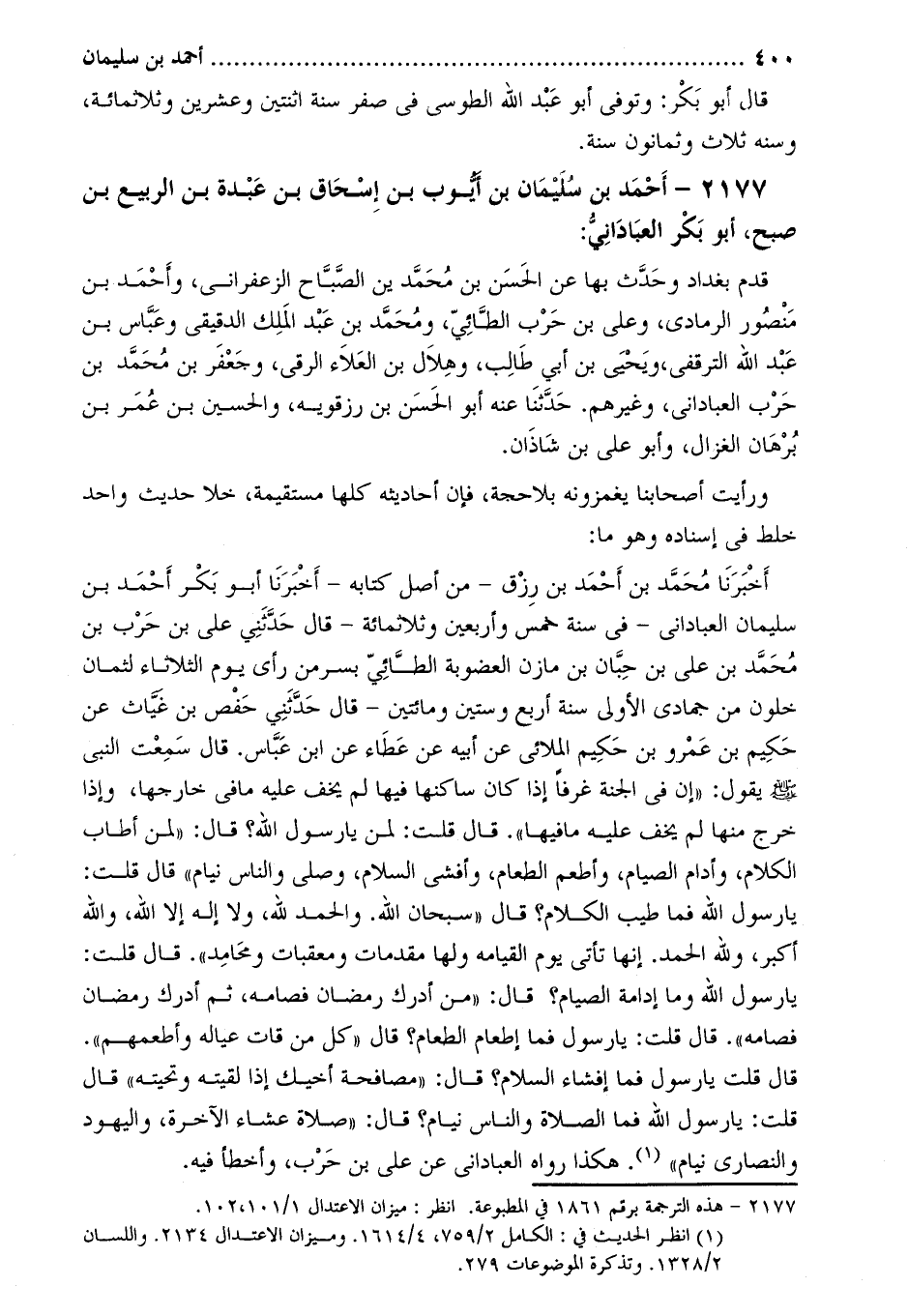2177- أَحْمَد بْن سُلَيْمَان بْن أَيُّوب بْن إِسْحَاق بْن عبدة بْن الربيع بن صبح، أَبُو بَكْر العباداني [1] :