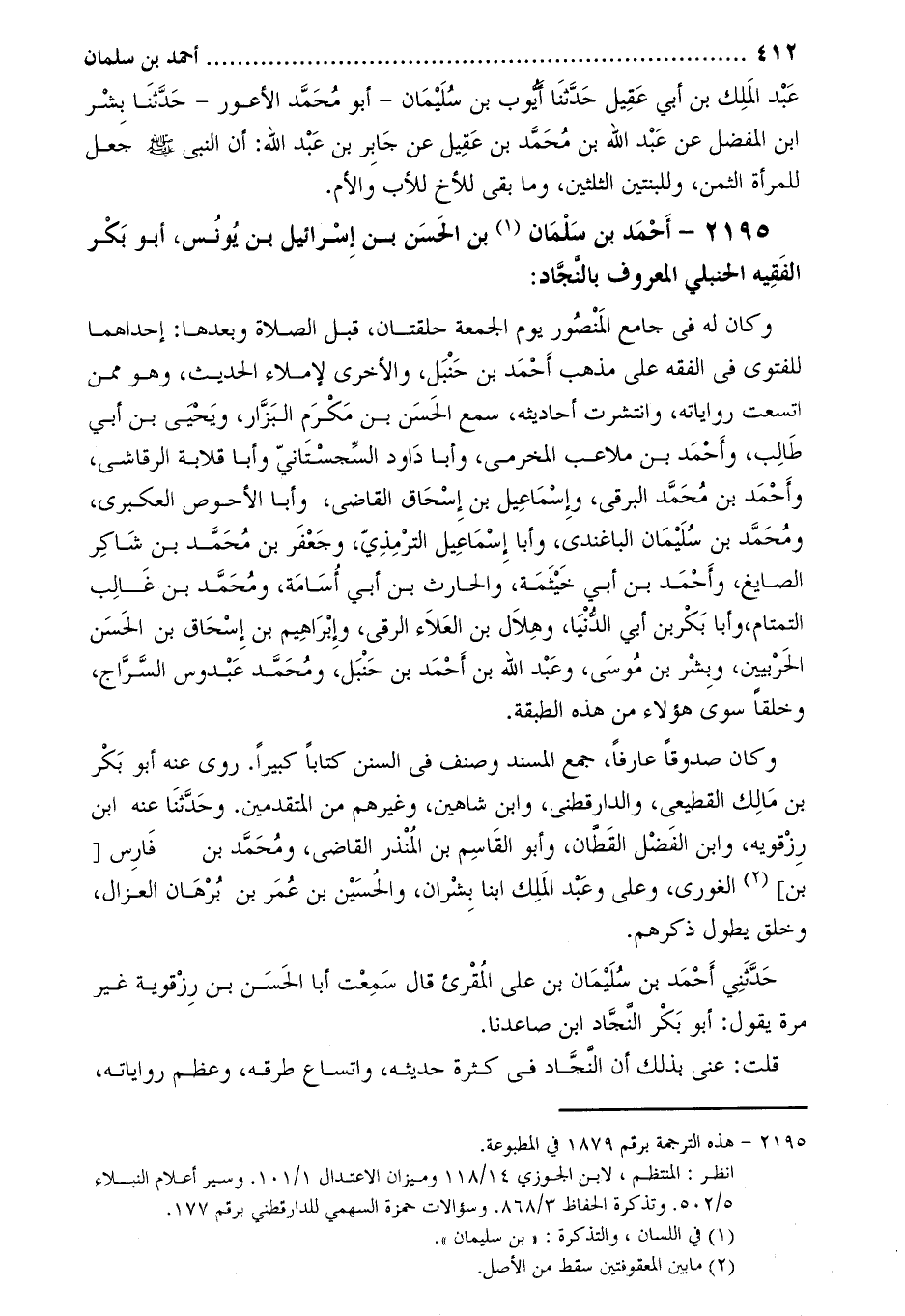 2195-[1] أَحْمَد بْن سلمان [2] بْن الْحَسَن بْن إسرائيل بْن يونس، أَبُو بَكْر الْفَقِيه الحنبلي الْمَعْرُوف بالنجاد:
