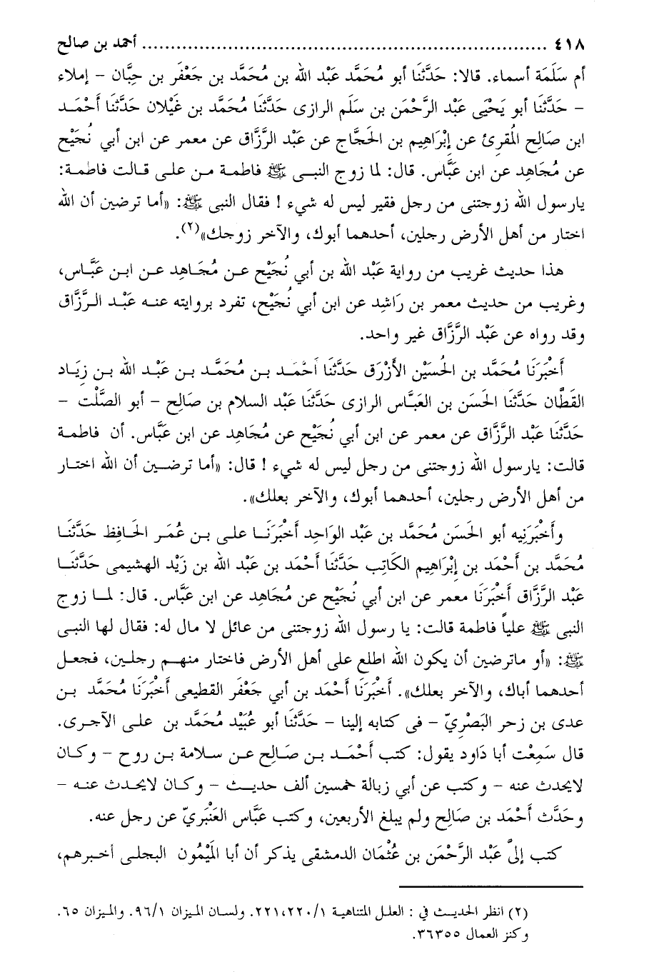 أَخْبَرَنَا محمّد بن الحسين الأزرق حَدَّثَنَا أَحْمَدُ بْنُ مُحَمَّدِ بْنِ عَبْدِ اللَّهِ بن زياد القطّان حدّثنا الحسن بن العبّاس الرازي حَدَّثَنَا عَبْدُ السَّلامِ بْنُ صَالِحٍ- أَبُو الصَّلْتِ- حَدَّثَنَا عَبْدُ الرَّزَّاقِ عَنْ مَعْمَرٍ عَنِ ابْنِ أَبِي نَجِيحٍ عَنْ مُجَاهِدٍ عَنِ ابن عباس. أَنَّ فَاطِمَةَ قَالَتْ: يَا رَسُولَ اللَّهِ زَوَّجْتَنِي مِنْ رَجُلٍ لَيْسَ لَهُ شَيْءٌ! قَالَ: «أَمَا تَرْضِينَ أَنَّ اللَّهَ اخْتَارَ مِنْ أهل الأرض رَجُلَيْنِ، أَحَدُهُمَا أَبُوكِ، وَالآخَرُ بَعْلُكِ»