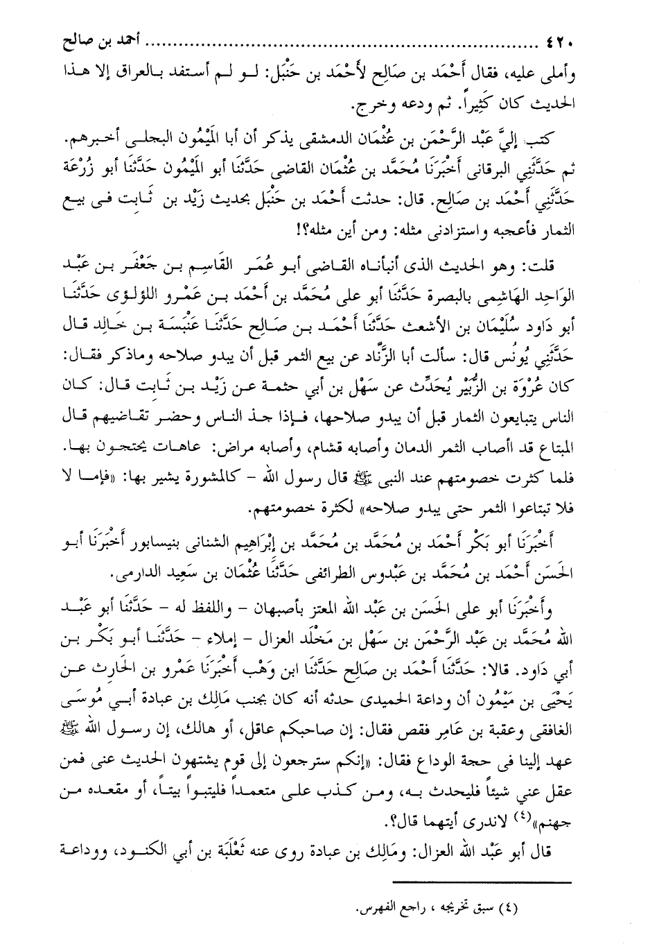 ثم حدّثني البرقاني أخبرنا محمّد بن عثمان القاضي حدّثنا أبو الميمون حدّثنا أبو زرعة حَدَّثَنِي أَحْمَد بْن صالح. قَالَ: حدثت أَحْمَد بْن حنبل بحديث زَيْد بْن ثابت فِي بيع الثمار فأعجبه واستزادنى مثله: ومن أين مثله؟! قُلْتُ: وَهُوَ الْحَدِيثُ الَّذِي