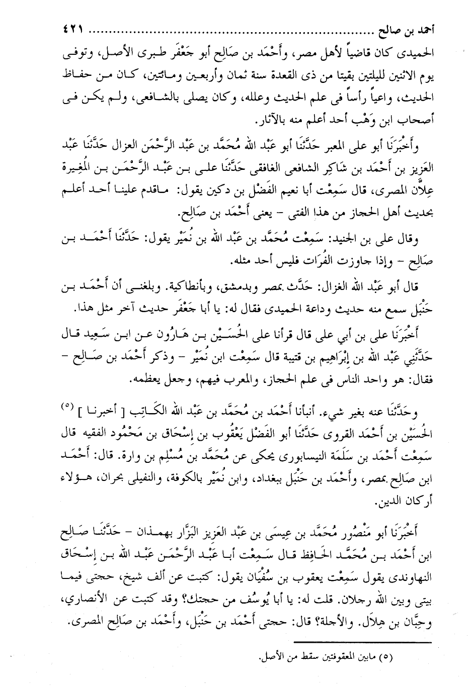 وَأَخْبَرَنَا أَبُو عَلِيٍّ المعبر حَدَّثَنَا أَبُو عَبْدِ اللَّهِ مُحَمَّدُ بْنُ عَبْدِ الرّحمن العزال حدّثنا عبد العزيز بن أحمد بن شاكر الشافعي الغافقي حَدَّثَنَا عَلِيّ بْن عَبْد الرَّحْمَن بْن المغيرة علان المصري، قَالَ سَمِعْتُ أَبَا نعيم الْفَضْل بْن دكين يَقُولُ: ما قدم عَلَيْنَا أحد أعلم بحديث أهل الحجاز من هَذَا الفتى- يَعْنِي أَحْمَد بْن صالح.