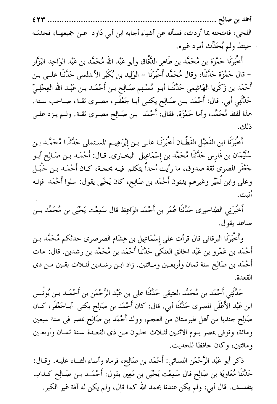 أَخْبَرَنَا حمزة بْن مُحَمَّد بْن طَاهِر الدَّقَّاق وأَبُو عَبْد اللَّه مُحَمَّد بْن عَبْد الواحد البزّار- قَالَ حمزة حَدَّثَنَا، وَقَالَ مُحَمَّد أَخْبَرَنَا- الوليد بن بكير الأندلسى حدثنا علي بن أحمد بن زكريا الهاشمي حدثنا أبو مسلم صالح بن أحمد بن عبد الله العجليّ حَدَّثَنِي أَبِي. قَالَ: أَحْمَد بْن صالح يكنى أَبَا جعفر، مصري ثقة، صاحب سنة.