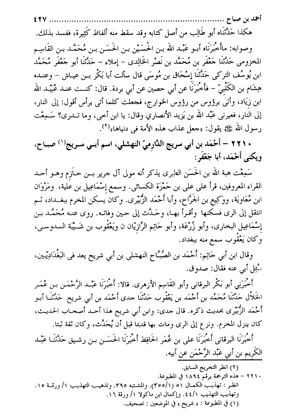 . 2210-[2] أَحْمَد بْن أَبِي سُرَيْج الدارمي النهشلي، اسم أَبِي سُرَيْج [3] صباح، ويكنى أَحْمَد، أَبَا جعفر: