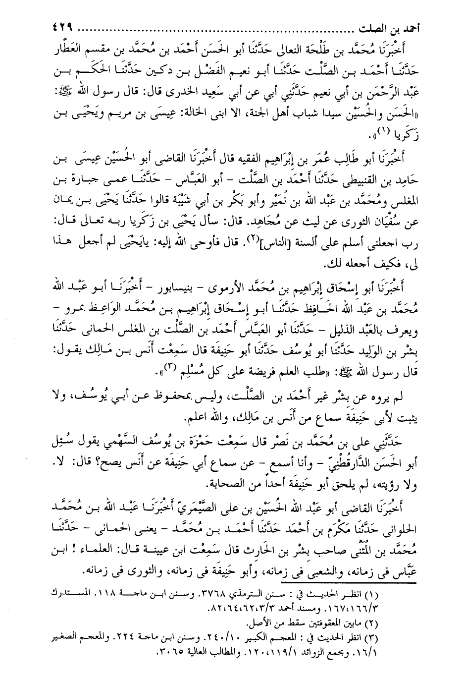 أَخْبَرَنَا أَبُو إِسْحَاقَ إِبْرَاهِيمُ بْنُ مُحَمَّدٍ الأرموي- بنيسابور- أخبرنا أبو عبد الله محمد بن عبد الله الحافظ حَدَّثَنَا أَبُو إِسْحَاقَ إِبْرَاهِيمُ بْنُ مُحَمَّدٍ الْوَاعِظُ بمرو- ويعرف بالعبد الذليل- حَدَّثَنَا أَبُو الْعَبَّاسِ أَحْمَدُ بْنُ الصَّلْتِ بْنِ المغلس الحماني حدّثنا بشر بن الوليد حدّثنا أبو يوسف حَدَّثَنَا أَبُو حَنِيفَةَ قَالَ سَمِعْتُ أَنَسَ بْنَ مَالِكٍ يَقُولُ: