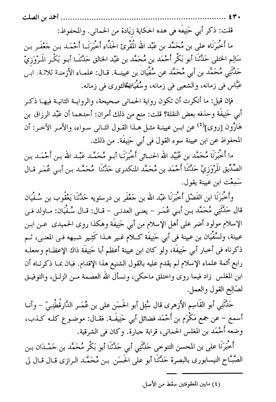 فإن قيل: ما أنكرت أن تكون رواية الحماني صحيحة، والرواية الثانية فيها ذكر أَبِي حنيفة وحذفه بعض النقلة؟ قلت: منع من ذلك أمران: أحدهما أن عَبْد الرزاق بن هارون [روى] [1] عَنِ ابن عيينة مثل هَذَا القول الثاني سواء، والأمر الآخر: أن المحفوظ عَنِ ابن عيينة سوء القول فِي أَبِي حنيفة. من ذلك.