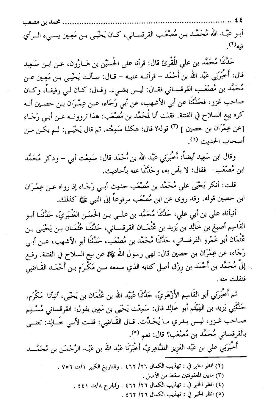 حدّثنا محمد بن علي المقرئ قال: قرأنا على الحسين بن هارون، عن ابن سعيد قال: أَخْبَرَنِي عبد الله بن أحمد- قرأته عليه- قَالَ: سألت يَحْيَى بْن معين عَن مُحَمَّد بْن مصعب القرقساني فقال: ليس بشيء. وَقَالَ: كان لي رفيقا، وكان صاحب غزو، فحدثنا عن أبي الأشهب، عن أبي رجاء، عن عمران بن حصين أنه كره بيع السلاح في الفتنة. فقلت أنا لمحمد بن مصعب: هذا تروونه عن أبي رجاء [عن عمران بن حصين] [2] قوله؟ قَالَ: هكذا سمعته. ثم قَالَ يحيى: لم يكن من أصحاب الحديث [3] .