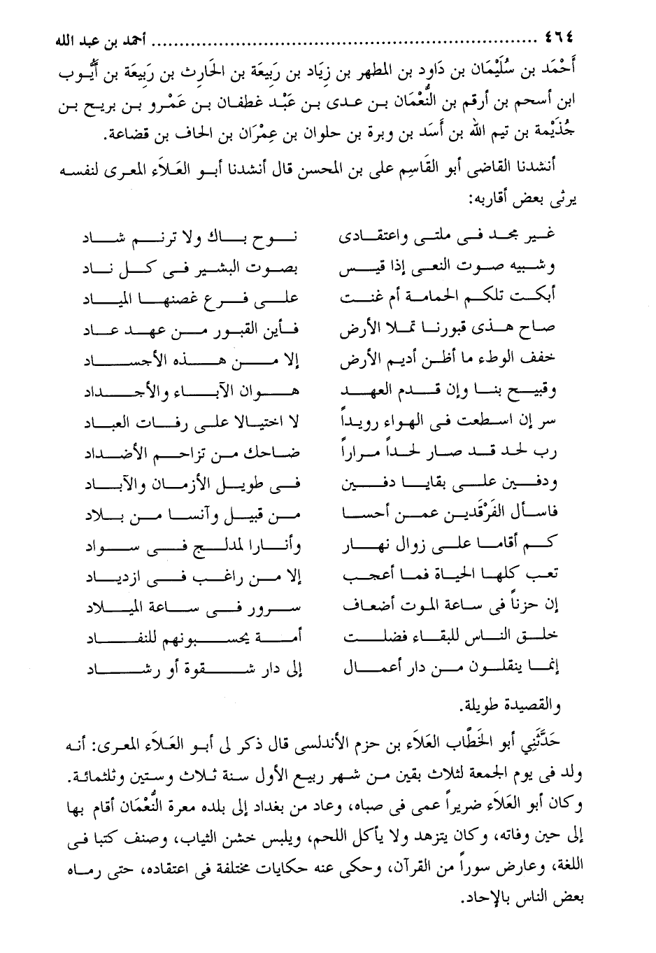 أنشدنا الْقَاضِي أَبُو الْقَاسِم عَلِيّ بْن المحسن قَالَ أنشدنا أَبُو العلاء المعري لنفسه يرثى بعض أقاربه: