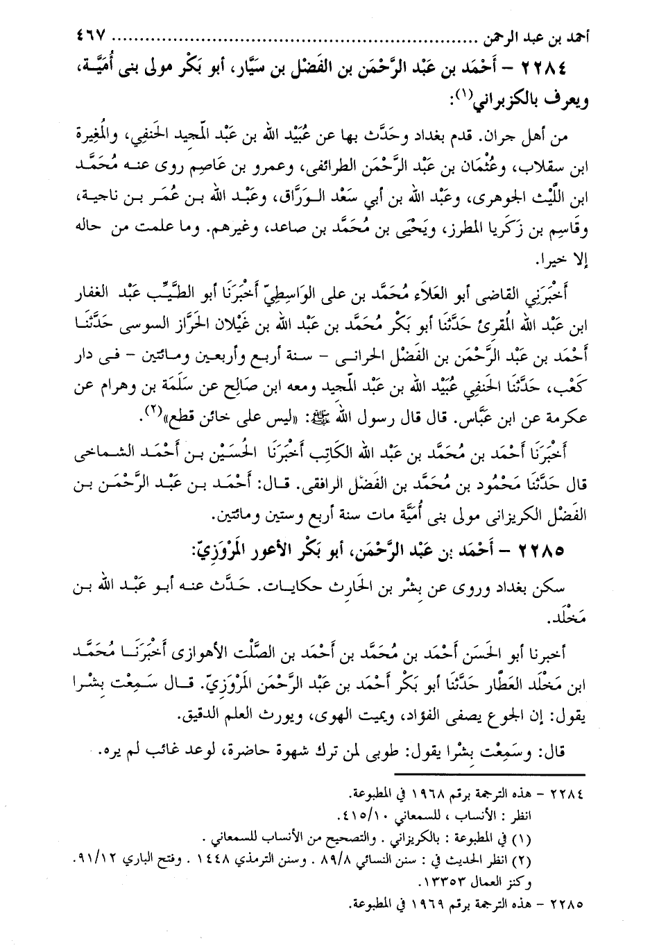 2284-[1] أَحْمَد بْن عَبْد الرَّحْمَن بْن الْفَضْل بْن سيار، أَبُو بَكْر مولى بني أمية، ويعرف بالكزبراني [2] :