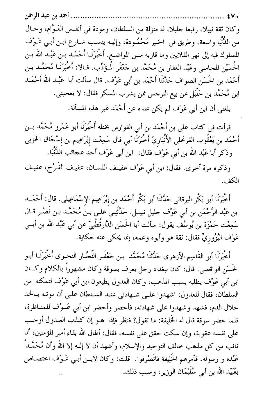 وَكَانَ ثِقَةً نبيلا، رفيعا جليلا، لَهُ منزلة من السلطان، ومودة فِي أنفس العوام، وحال من الدّنيا واسعة، وطريق فِي الخير محمودة، وإليه ينسب شارع ابْن أَبِي عوف المسلوك فيه إِلَى نهر القلائين وما قاربه من المواضع. أَخْبَرَنَا أَحْمَدُ بْنُ عَبْدِ اللَّهِ بْنِ الْحُسَيْنِ المحاملي وعَبْدُ الْغَفَّارِ بْنُ مُحَمَّدِ بْنِ جَعْفَرٍ الْمُؤَدِّبُ. قَالا: أَخْبَرَنَا مُحَمَّدُ بْنُ أَحْمَدَ بْنِ الْحَسَنِ الصواف حَدَّثَنَا أَحْمَد بْن أَبِي عوف. قَالَ سألت أبا عبد الله أحمد ابن مُحَمَّد بْن حنبل عَنْ بيع النرجس ممن يشرب المسكر فَقَالَ: لا يعجبني.