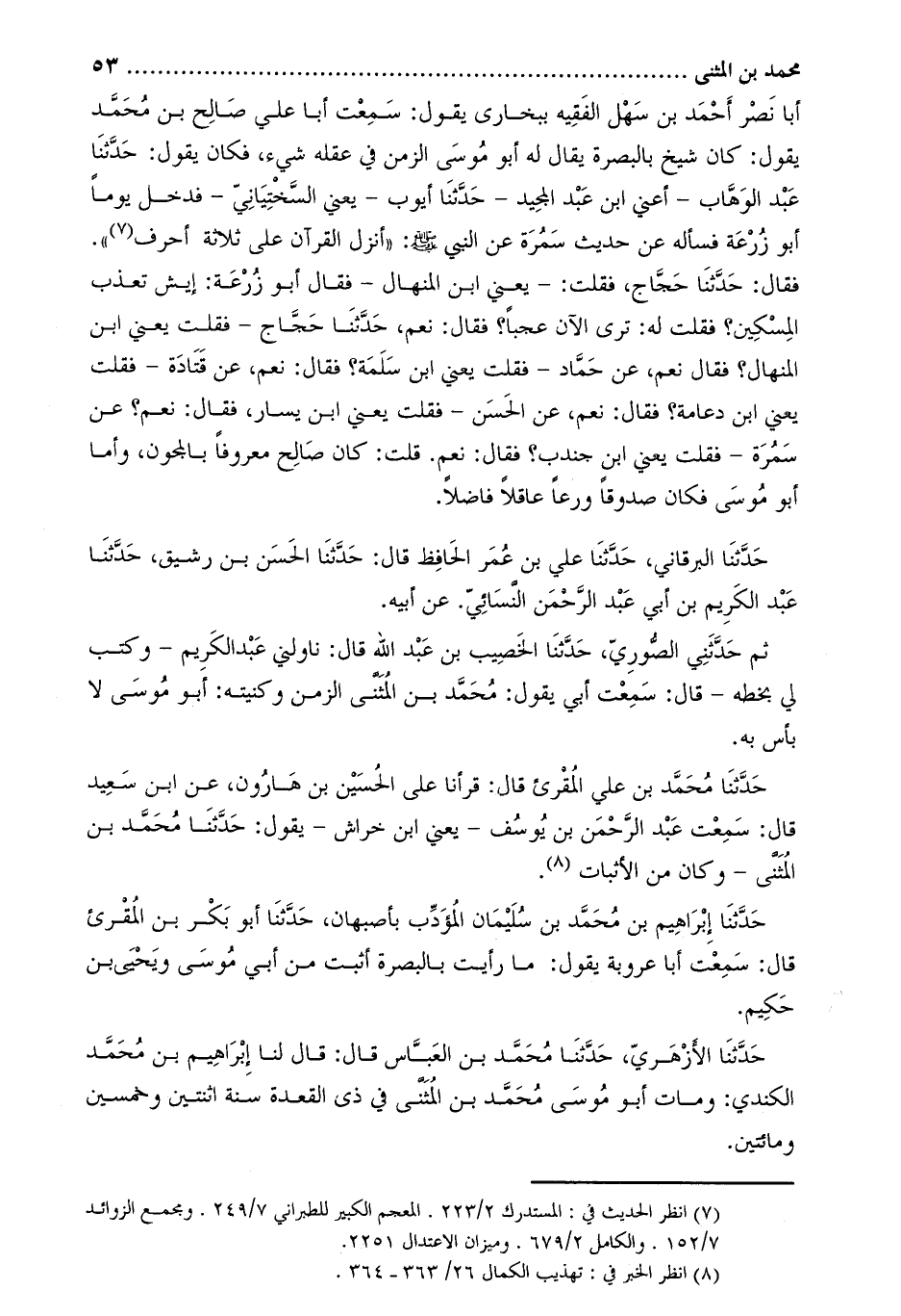 حدّثنا الأزهريّ، حَدَّثَنَا مُحَمَّدُ بْنُ الْعَبَّاس قَالَ: قَالَ لنا إبراهيم بن محمد الكندي: ومات أبو موسى محمد بن المثنى فِي ذي القعدة سنة اثنتين وخمسين ومائتين.