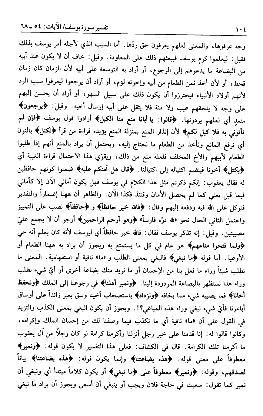 وجه عرفوها، والمعنى لعلهم يعرفون حق ردّها. أما السبب الذي لأجله أمر يوسف بذلك فقيل: ليعلموا كرم يوسف فيبعثهم ذلك على المعاودة. وقيل: خاف أن لا يكون عند أبيه من البضاعة ما يدعوهم إلى الرجوع، أو أراد به التوسعة على أبيه لأن الزمان كان زمان قحط، أو لأن أخذ ثمن الطعام من أبيه وإخوته لؤم، أو أراد أن يرجعوا ليعرفوا سبب الرد لأنهم أولاد الأنبياء فيحترزوا أن يكون ذلك على سبيل السهو، أو أراد أن يحسن إليهم على وجه لا يلحقهم عيب ولا منة فلا يثقل على أبيه إرسال أخيه. وقيل: يَرْجِعُونَ متعد أي لعلهم يردونها. قالُوا: يا أَبانا مُنِعَ مِنَّا الْكَيْلُ أرادوا قول يوسف فَإِنْ لَمْ تَأْتُونِي بِهِ فَلا كَيْلَ لَكُمْ لأن إنذار المنع بمنزلة المنع يؤيده قراءة من قرأ نَكْتَلْ بالنون أي نرفع المانع ونأخذ من الطعام ما نحتاج إليه، ويحتمل أن يراد بالمنع أنهم إذا طلبوا الطعام لأبيهم والأخ المخلف فلعله منع من ذلك، ويقوّي هذا الاحتمال قراءة الغيبة أي يكتل أخونا فينضم اكتياله إلى اكتيالنا. قالَ هَلْ آمَنُكُمْ عَلَيْهِ ضمنوا كونهم حافظين له فقال يعقوب: إنكم ذكرتم مثل هذا الكلام في يوسف فهل يكون أماني الآن إلا كأماني فيما قبل يعني كما لم يحصل الأمان وقتئذ فكذا الآن. والظاهر أن هاهنا إضمارا والتقدير فتوكل على الله فيه ودفعه إليهم وقال: فَاللَّهُ خَيْرٌ حافِظاً وحافِظاً نصب على التمييز واحتمل الثاني الحال نحو «لله درّه فارسا» وَهُوَ أَرْحَمُ الرَّاحِمِينَ أرجو أن لا يجمع عليّ مصيبتين. وقيل: إنه تذكر يوسف فقال: فالله خير حافظا أي ليوسف لأنه كان يعلم أنه حي وَلَمَّا فَتَحُوا مَتاعَهُمْ هو عام في كل ما يستمتع به ويجوز أن يراد به هاهنا الطعام أو الأوعية. أما قوله ما نَبْغِي فالبغي بمعنى الطلب و «ما» نافية أو استفهامية. المعنى ما نطلب شيئا وراء ما فعل بنا من الإحسان أو ما نريد منك بضاعة أخرى أو أيّ شيء نطلب وراء هذا نستظهر بالبضاعة المردودة إلينا. وَنَمِيرُ أَهْلَنا في رجوعنا إلى الملك وَنَحْفَظُ أَخانا فما يصيبه شيء مما يخافه وَنَزْدادُ باستصحاب أخينا وسق بعير زائدا على أوساق أباعرنا فأيّ شيء نبغي وراء هذه المباغي؟!. ويجوز أن يكون البغي بمعنى الكذب والتزيد في القول على أن «ما» نافية أي ما نكذب فيما وصفنا لك من إحسان الملك وإكرامه، وكانوا قالوا له: إنا قدمنا على خير رجل أنزلنا وأكرمنا كرامة لو كان رجلا من آل يعقوب ما أكرمنا تلك الكرامة. قال في الكشاف: فعلى هذا التفسير لا يكون قوله: وَنَمِيرُ معطوفا على معنى قوله: هذِهِ بِضاعَتُنا وإنما يكون قوله: هذِهِ بِضاعَتُنا بيانا لصدقهم، وقوله: وَنَمِيرُ معطوفا على ما نَبْغِي أو يكون كلاما مبتدأ أي ونبغي أن نمير كما تقول: سعيت في حاجة فلان ويجب أو ينبغي أن أسعى ويجوز أن يراد ما نبغي