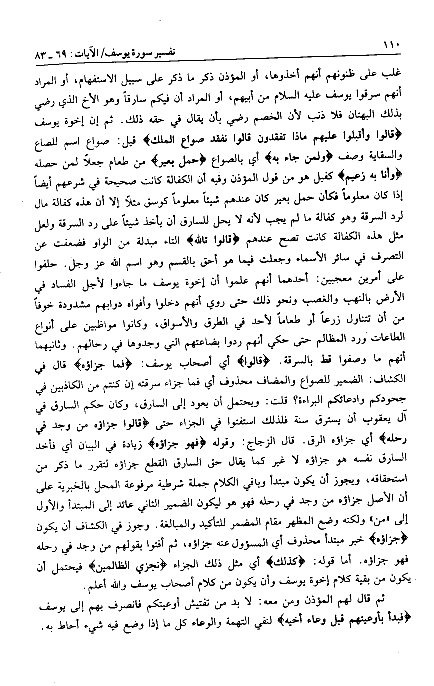 غلب على ظنونهم أنهم أخذوها، أو المؤذن ذكر ما ذكر على سبيل الاستفهام، أو المراد أنهم سرقوا يوسف عليه السلام من أبيهم، أو المراد أن فيكم سارقا وهو الأخ الذي رضي بذلك البهتان فلا ذنب لأن الخصم رضي بأن يقال في حقه ذلك. ثم إن إخوة يوسف قالُوا وَأَقْبَلُوا عَلَيْهِمْ ماذا تَفْقِدُونَ قالُوا نَفْقِدُ صُواعَ الْمَلِكِ قيل: صواع اسم للصاع والسقاية وصف وَلِمَنْ جاءَ بِهِ أي بالصواع حِمْلُ بَعِيرٍ من طعام جعلا لمن حصله وَأَنَا بِهِ زَعِيمٌ كفيل هو من قول المؤذن وفيه أن الكفالة كانت صحيحة في شرعهم أيضا إذا كان معلوما فكأن حمل بعير كان عندهم شيئا معلوما كوسق مثلا إلا أن هذه كفالة مال لرد السرقة وهو كفالة ما لم يجب لأنه لا يحل للسارق أن يأخذ شيئا على رد السرقة ولعل مثل هذه الكفالة كانت تصح عندهم قالُوا تَاللَّهِ التاء مبدلة من الواو فضعفت عن التصرف في سائر الأسماء وجعلت فيما هو أحق بالقسم وهو اسم الله عز وجل. حلفوا على أمرين معجبين: أحدهما أنهم علموا أن إخوة يوسف ما جاءوا لأجل الفساد في الأرض بالنهب والغصب ونحو ذلك حتى روي أنهم دخلوا وأفواه دوابهم مشدودة خوفا من أن تتناول زرعا أو طعاما لأحد في الطرق والأسواق، وكانوا مواظبين على أنواع الطاعات ورد المظالم حتى حكي أنهم ردوا بضاعتهم التي وجدوها في رحالهم. وثانيهما أنهم ما وصفوا قط بالسرقة. قالُوا أي أصحاب يوسف: فَما جَزاؤُهُ قال في الكشاف: الضمير للصواع والمضاف محذوف أي فما جزاء سرقته إن كنتم من الكاذبين في جحودكم وادعائكم البراءة؟ قلت: ويحتمل أن يعود إلى السارق، وكان حكم السارق في آل يعقوب أن يسترق سنة فلذلك استفتوا في الجزاء حتى قالُوا جَزاؤُهُ مَنْ وُجِدَ فِي رَحْلِهِ أي جزاؤه الرق. قال الزجاج: وقوله فَهُوَ جَزاؤُهُ زيادة في البيان أي فأخد السارق نفسه هو جزاؤه لا غير كما يقال حق السارق القطع جزاؤه لتقرر ما ذكر من استحقاقه، ويجوز أن يكون مبتدأ وباقي الكلام جملة شرطية مرفوعة المحل بالخبرية على أن الأصل جزاؤه من وجد في رحله فهو هو ليكون الضمير الثاني عائد إلى المبتدأ والأول إلى «من» ولكنه وضع المظهر مقام المضمر للتأكيد والمبالغة. وجوز في الكشاف أن يكون جَزاؤُهُ خبر مبتدأ محذوف أي المسئول عنه جزاؤه، ثم أفتوا بقولهم من وجد في رحله فهو جزاؤه. أما قوله: كَذلِكَ أي مثل ذلك الجزاء نَجْزِي الظَّالِمِينَ فيحتمل أن يكون من بقية كلام إخوة يوسف وأن يكون من كلام أصحاب يوسف والله أعلم.