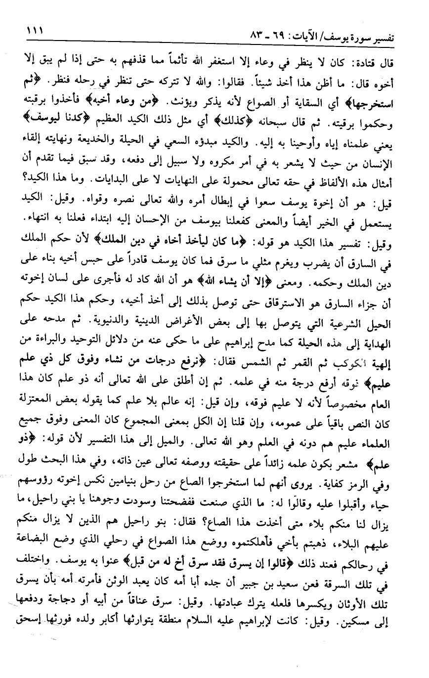 وقيل: تفسير هذا الكيد هو قوله: ما كانَ لِيَأْخُذَ أَخاهُ فِي دِينِ الْمَلِكِ لأن حكم الملك في السارق أن يضرب ويغرم مثلي ما سرق فما كان يوسف قادرا على حبس أخيه بناء على دين الملك وحكمه. ومعنى إِلَّا أَنْ يَشاءَ اللَّهُ هو أن الله كاد له فأجرى على لسان إخوته أن جزاء السارق هو الاسترقاق حتى توصل بذلك إلى أخذ أخيه، وحكم هذا الكيد حكم الحيل الشرعية التي يتوصل بها إلى بعض الأغراض الدينية والدنيوية. ثم مدحه على الهداية إلى هذه الحيلة كما مدح إبراهيم على ما حكى عنه من دلائل التوحيد والبراءة من إلهية الكوكب ثم القمر ثم الشمس فقال: نَرْفَعُ دَرَجاتٍ مَنْ نَشاءُ وَفَوْقَ كُلِّ ذِي عِلْمٍ عَلِيمٌ فوقه أرفع درجة منه في علمه. ثم إن أطلق على الله تعالى أنه ذو علم كان هذا العام مخصوصا لأنه لا عليم فوقه، وإن قيل: إنه عالم بلا علم كما يقوله بعض المعتزلة كان النص باقيا على عمومه، وإن قلنا إن الكل بمعنى المجموع كان المعنى وفوق جميع العلماء عليم هم دونه في العلم وهو الله تعالى. والميل إلى هذا التفسير لأن قوله: لَذُو عِلْمٍ مشعر بكون علمه زائدا على حقيقته ووصفه تعالى عين ذاته، وفي هذا البحث طول وفي الرمز كفاية.