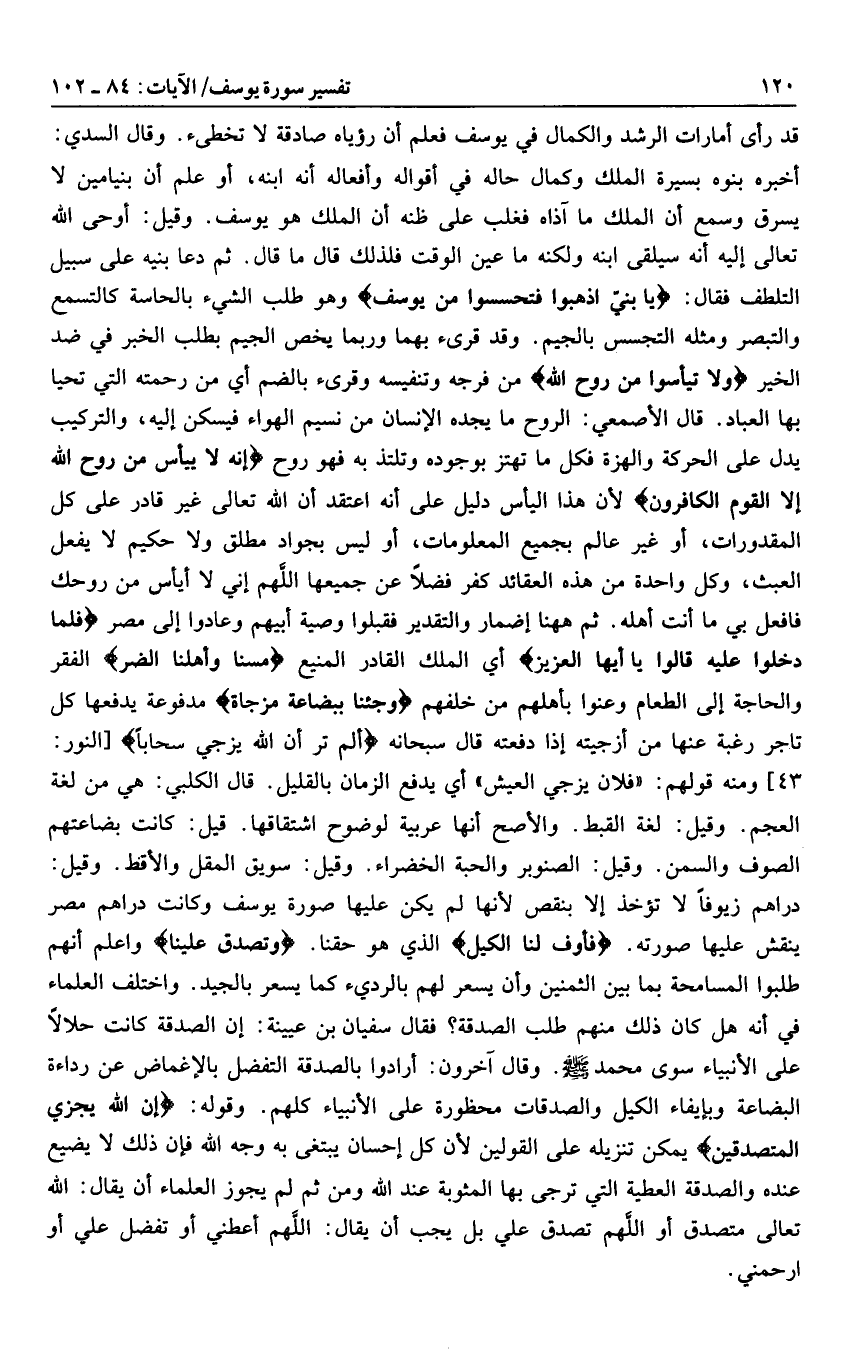أخبره بنوه بسيرة الملك وكمال حاله في أقواله وأفعاله أنه ابنه، أو علم أن بنيامين لا يسرق وسمع أن الملك ما آذاه فغلب على ظنه أن الملك هو يوسف. وقيل: أوحى الله تعالى إليه أنه سيلقى ابنه ولكنه ما عين الوقت فلذلك قال ما قال. ثم دعا بنيه على سبيل التلطف فقال: يا بَنِيَّ اذْهَبُوا فَتَحَسَّسُوا مِنْ يُوسُفَ وهو طلب الشيء بالحاسة كالتسمع والتبصر ومثله التجسس بالجيم. وقد قرىء بهما وربما يخص الجيم بطلب الخبر في ضد الخير وَلا تَيْأَسُوا مِنْ رَوْحِ اللَّهِ من فرجه وتنفيسه وقرىء بالضم أي من رحمته التي تحيا بها العباد. قال الأصمعي: الروح ما يجده الإنسان من نسيم الهواء فيسكن إليه، والتركيب يدل على الحركة والهزة فكل ما تهتز بوجوده وتلتذ به فهو روح إِنَّهُ لا يَيْأَسُ مِنْ رَوْحِ اللَّهِ إِلَّا الْقَوْمُ الْكافِرُونَ لأن هذا اليأس دليل على أنه اعتقد أن الله تعالى غير قادر على كل المقدورات، أو غير عالم بجميع المعلومات، أو ليس بجواد مطلق ولا حكيم لا يفعل العبث، وكل واحدة من هذه العقائد كفر فضلا عن جميعها اللهم إني لا أيأس من روحك فافعل بي ما أنت أهله. ثم هاهنا إضمار والتقدير فقبلوا وصية أبيهم وعادوا إلى مصر فَلَمَّا دَخَلُوا عَلَيْهِ قالُوا يا أَيُّهَا الْعَزِيزُ أي الملك القادر المنيع مَسَّنا وَأَهْلَنَا الضُّرُّ الفقر والحاجة إلى الطعام وعنوا بأهلهم من خلفهم وَجِئْنا بِبِضاعَةٍ مُزْجاةٍ مدفوعة يدفعها كل تاجر رغبة عنها من أزجيته إذا دفعته قال سبحانه أَلَمْ تَرَ أَنَّ اللَّهَ يُزْجِي سَحاباً [النور:
