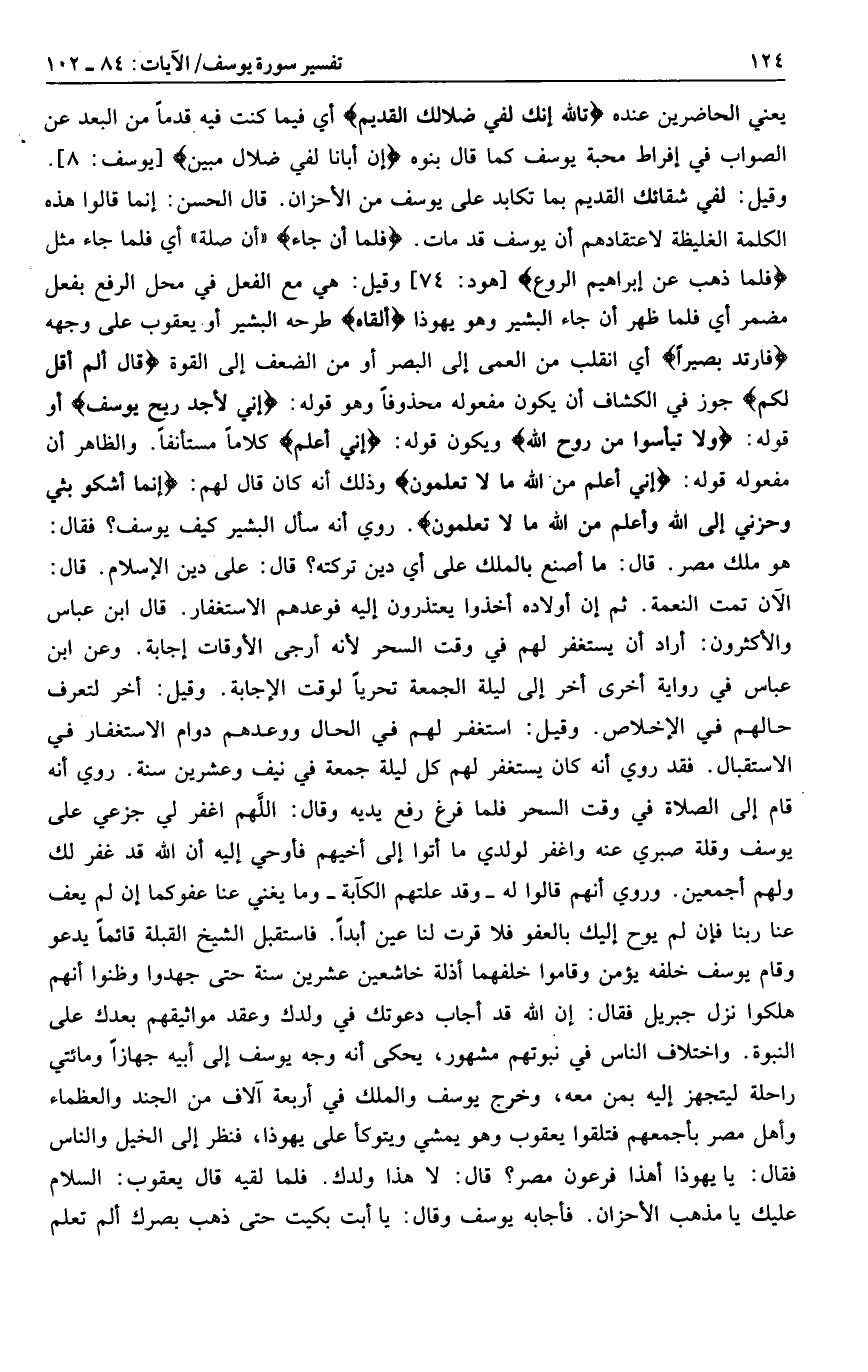 وقيل: لفي شقائك القديم بما تكابد على يوسف من الأحزان. قال الحسن: إنما قالوا هذه الكلمة الغليظة لاعتقادهم أن يوسف قد مات. فَلَمَّا أَنْ جاءَ «أن صلة» أي فلما جاء مثل فَلَمَّا ذَهَبَ عَنْ إِبْراهِيمَ الرَّوْعُ [هود: 74] وقيل: هي مع الفعل في محل الرفع بفعل مضمر أي فلما ظهر أن جاء البشير وهو يهوذا أَلْقاهُ طرحه البشير أو يعقوب على وجهه فَارْتَدَّ بَصِيراً أي انقلب من العمى إلى البصر أو من الضعف إلى القوة قالَ أَلَمْ أَقُلْ لَكُمْ جوز في الكشاف أن يكون مفعوله محذوفا وهو قوله: إِنِّي لَأَجِدُ رِيحَ يُوسُفَ أو قوله: وَلا تَيْأَسُوا مِنْ رَوْحِ اللَّهِ ويكون قوله: إِنِّي أَعْلَمُ كلاما مستأنفا. والظاهر أن مفعوله قوله: إِنِّي أَعْلَمُ مِنَ اللَّهِ ما لا تَعْلَمُونَ وذلك أنه كان قال لهم: نَّما أَشْكُوا بَثِّي وَحُزْنِي إِلَى اللَّهِ وَأَعْلَمُ مِنَ اللَّهِ ما لا تَعْلَمُونَ.