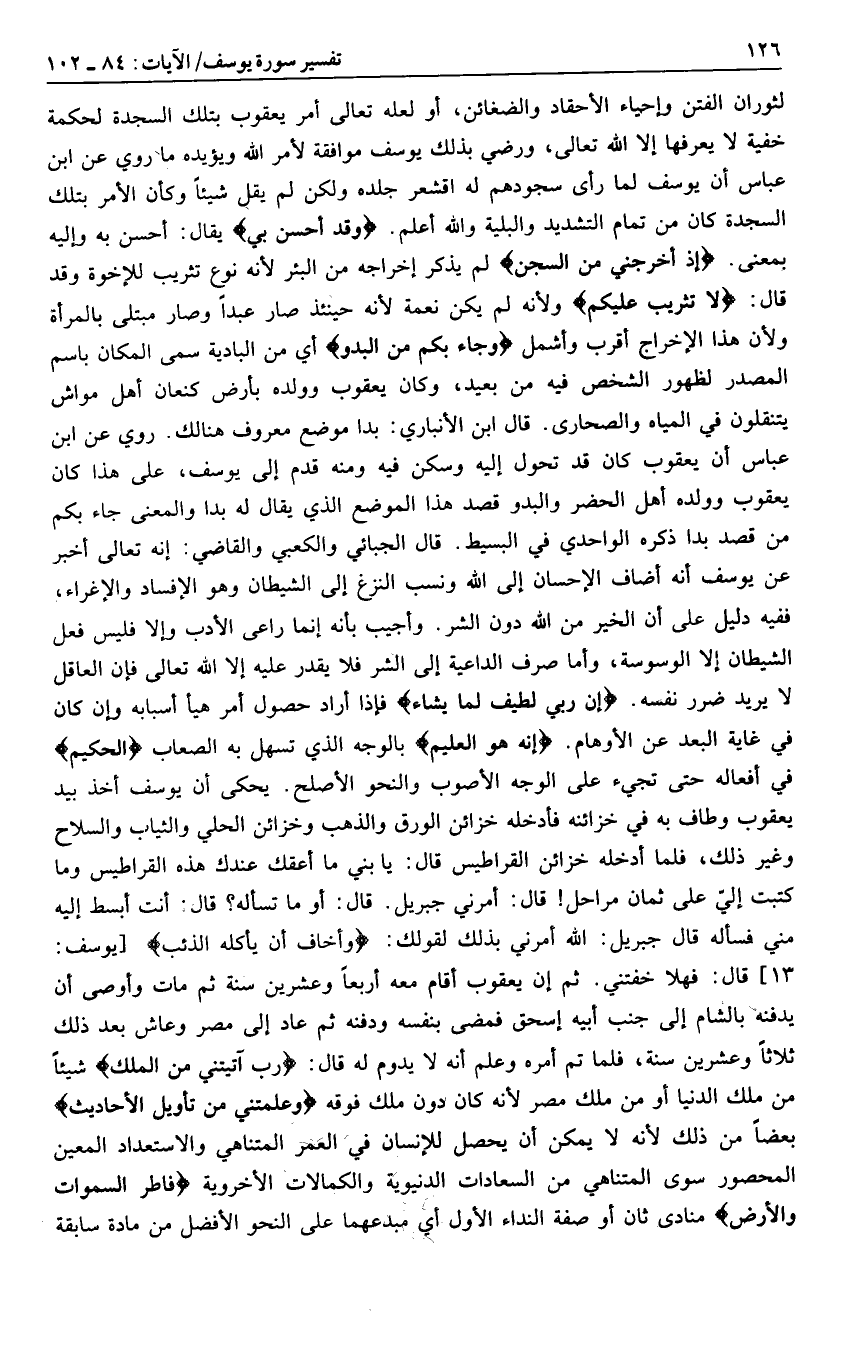 لثوران الفتن وإحياء الأحقاد والضغائن، أو لعله تعالى أمر يعقوب بتلك السجدة لحكمة خفية لا يعرفها إلا الله تعالى، ورضي بذلك يوسف موافقة لأمر الله ويؤيده ما روي عن ابن عباس أن يوسف لما رأى سجودهم له اقشعر جلده ولكن لم يقل شيئا وكأن الأمر بتلك السجدة كان من تمام التشديد والبلية والله أعلم. وَقَدْ أَحْسَنَ بِي يقال: أحسن به وإليه بمعنى. إِذْ أَخْرَجَنِي مِنَ السِّجْنِ لم يذكر إخراجه من البئر لأنه نوع تثريب للإخوة وقد قال: لا تَثْرِيبَ عَلَيْكُمُ ولأنه لم يكن نعمة لأنه حينئذ صار عبدا وصار مبتلى بالمرأة ولأن هذا الإخراج أقرب وأشمل وَجاءَ بِكُمْ مِنَ الْبَدْوِ أي من البادية سمى المكان باسم المصدر لظهور الشخص فيه من بعيد، وكان يعقوب وولده بأرض كنعان أهل مواش يتنقلون في المياه والصحارى. قال ابن الأنباري: بدا موضع معروف هنالك. روي عن ابن عباس أن يعقوب كان قد تحول إليه وسكن فيه ومنه قدم إلى يوسف، على هذا كان يعقوب وولده أهل الحضر والبدو قصد هذا الموضع الذي يقال له بدا والمعنى جاء بكم من قصد بدا ذكره الواحدي في البسيط. قال الجبائي والكعبي والقاضي: إنه تعالى أخبر عن يوسف أنه أضاف الإحسان إلى الله ونسب النزغ إلى الشيطان وهو الإفساد والإغراء، ففيه دليل على أن الخير من الله دون الشر. وأجيب بأنه إنما راعى الأدب وإلا فليس فعل الشيطان إلا الوسوسة، وأما صرف الداعية إلى الشر فلا يقدر عليه إلا الله تعالى فإن العاقل لا يريد ضرر نفسه. إِنَّ رَبِّي لَطِيفٌ لِما يَشاءُ فإذا أراد حصول أمر هيأ أسبابه وإن كان في غاية البعد عن الأوهام. إِنَّهُ هُوَ الْعَلِيمُ بالوجه الذي تسهل به الصعاب الْحَكِيمُ في أفعاله حتى تجيء على الوجه الأصوب والنحو الأصلح.
